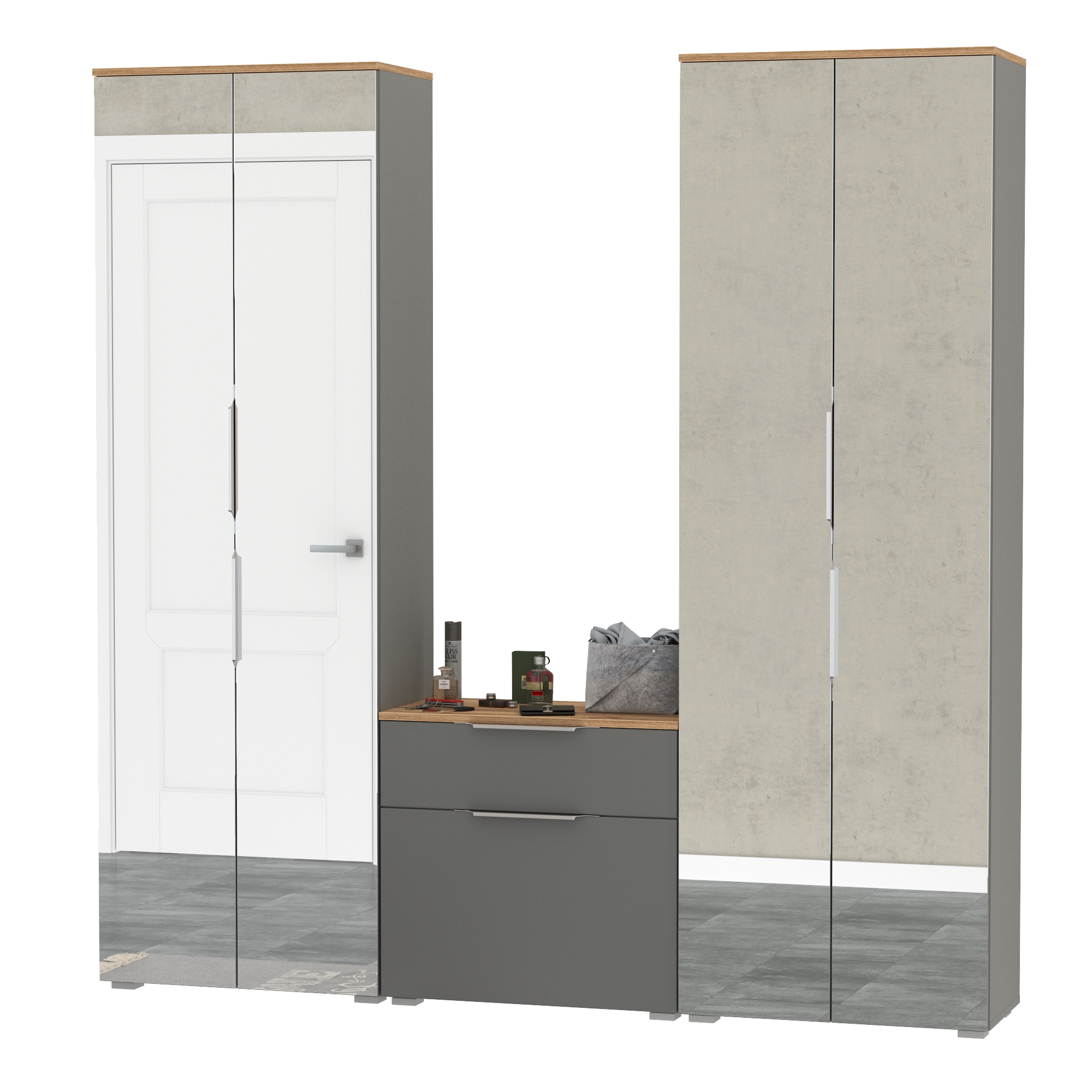 Сдержанный облик и компактная глубина сочетается с продуманным наполнением. Комплектация состоит из трех модулей - двух шкафов для одежды Октава 13.338 и тумбы для обуви Октава 16.127. Тумба для обуви Октава 16.127 с выдвижным ящиком для мелочей сверху и нишей с откидной дверкой с полками для обуви снизу. Отделение с откидной дверкой с полками вмещает до 6 пар невысокой обуви. Шариковые направляющие полного выдвижения обеспечивают тихую эксплуатацию выдвижного ящика. Двухдверный шкаф (в комплектации 2 единицы) за распашными дверками которого расположены антресольная полка для головных уборов, выдвижная штанга для одежды на плечиках и две полки и ниша снизу. Зеркальные створки шкафа визуально расширяют пространство, а минималистичные алюминиевые ручки подчеркивают легкость и простоту линий. Максимальная нагрузка на каждую полку составляет 8 кг. Металлические ручки выполнены из алюминиевого профиля надежно крепятся и удобно ложатся в руку. Визуально может показаться, что мебель без ручек. Такая видимость создается из-за того, что профиль крепится к торцовой части дверей и ящика. Мебель оснащена пластиковыми опорами серого цвета.
