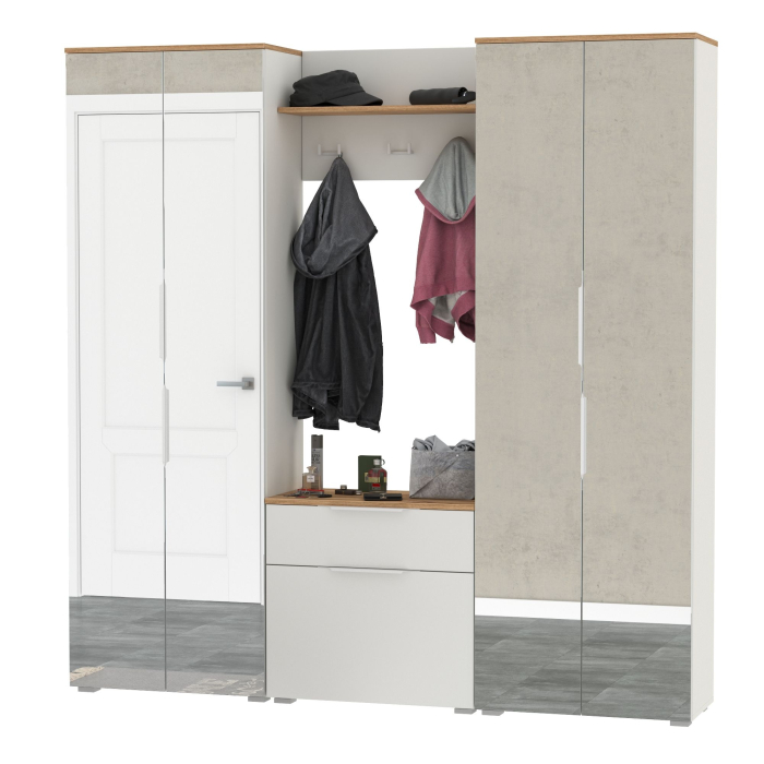 Сдержанный облик и компактная глубина сочетается с продуманным наполнением. Комплектация состоит из четырех модулей - двух шкафов для одежды Октава 13.338, тумбы для обуви Октава 16.127 и вешалки Октава 15.14.01. Тумба для обуви Октава 16.127 с выдвижным ящиком для мелочей сверху и нишей с откидной дверкой с полками для обуви снизу. Отделение с откидной дверкой с полками вмещает до 6 пар невысокой обуви. Шариковые направляющие полного выдвижения обеспечивают тихую эксплуатацию выдвижного ящика. Вешалка Октава 15.14.01 представляет из себя панель из МДФ с полкой для головных уборов с тремя двухрожковыми крючками под ней. В комплекте вешалки имеются скрытые крепления к стене. Максимальная нагрузка на полку составляет 3 кг, на каждый крючок - 1,5 кг. Два двухдверных шкафа (в комплектации 2 единицы) за распашными дверками каждого расположены антресольная полка для головных уборов, выдвижная штанга для одежды на плечиках и две полки и ниша снизу. Зеркальные створки шкафа визуально расширяют пространство, а минималистичные алюминиевые ручки подчеркивают легкость и простоту линий. Максимальная нагрузка на каждую полку составляет 8 кг. Металлические ручки выполнены из алюминиевого профиля надежно крепятся и удобно ложатся в руку. Визуально может показаться, что мебель без ручек. Такая видимость создается из-за того, что профиль крепится к торцовой части дверей и ящика. Мебель оснащена пластиковыми опорами серого цвета.