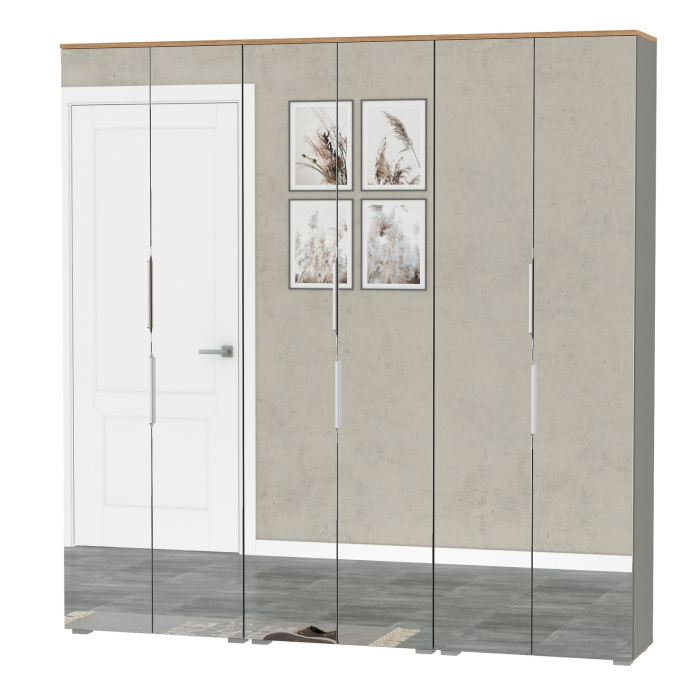Сдержанный облик и компактная глубина сочетается с продуманным наполнением. Комплектация состоит из трех модулей - трёх шкафов для одежды Октава 13.338. Двухдверный шкаф (в комплектации 3 единицы) за распашными дверками которого расположены антресольная полка для головных уборов, выдвижная штанга для одежды на плечиках и две полки и ниша снизу. Зеркальные створки шкафа визуально расширяют пространство, а минималистичные алюминиевые ручки подчеркивают легкость и простоту линий. Максимальная нагрузка на каждую полку составляет 8 кг. Металлические ручки выполнены из алюминиевого профиля надежно крепятся и удобно ложатся в руку. Визуально может показаться, что мебель без ручек. Такая видимость создается из-за того, что профиль крепится к торцовой части дверей, дополняя общюю композицию. Мебель оснащена пластиковыми опорами серого цвета.