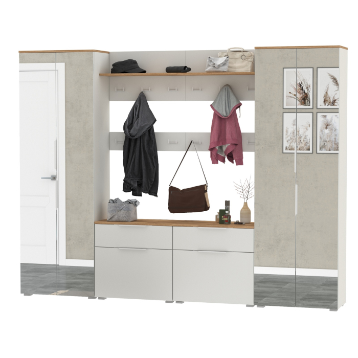 Сдержанный облик и компактная глубина сочетается с продуманным наполнением. Комплектация состоит из восьми модулей - двух шкафов для одежды Октава 13.338, двух тумб для обуви Октава 16.127, двух вешалок Октава 15.14.02 и двух вешалок Октава 15.14.01. Тумба для обуви Октава 16.127 (в комплектации 2 единицы) с выдвижным ящиком для мелочей сверху и нишей с откидной дверкой с полками для обуви снизу. Отделения с откидными дверками с полками вмещают до 12 пар невысокой обуви. Шариковые направляющие полного выдвижения. Вешалка Октава 15.14.01 (в комплектации 2 единицы) представляет из себя панель из МДФ с полкой для головных уборов с тремя двухрожковыми крючками под ней. Максимальная нагрузка на полку составляет 3 кг, на каждый крючок - 1,5 кг. Вешалка Октава 15.14.02 (в комплектации 2 единицы) представляет из себя панель из МДФ с тремя двухрожковыми крючками. Максимальная нагрузка на каждый крючок составляет 1,5 кг. Вешалки объединены и имеют 12 крючков для одежды. В комплекте вешалок имеются скрытые крепления к стене. Двухдверный шкаф (в комплектации 2 единицы) за распашными дверками которого расположены антресольная полка для головных уборов, выдвижная штанга для одежды на плечиках и две полки и ниша снизу. Зеркальные створки шкафа визуально расширяют пространство, а минималистичные алюминиевые ручки подчеркивают легкость и простоту линий. Максимальная нагрузка на каждую полку составляет 8 кг. Металлические ручки выполнены из алюминиевого профиля надежно крепятся и удобно ложатся в руку. Визуально может показаться, что мебель без ручек. Такая видимость создается из-за того, что профиль крепится к торцовой части дверей и ящика. Мебель оснащена пластиковыми опорами серого цвета.