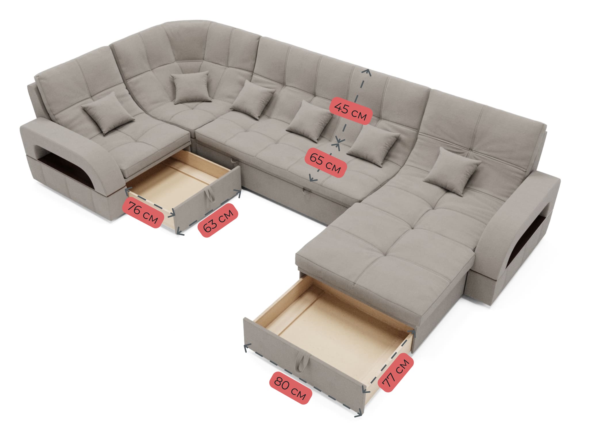 Он имеет высоту 97 см, ширину 350 см и глубину 187 см. Обит велюром - Veluta lux. Диван обладает универсальным расположением угла, что позволяет его использовать в любом помещении.