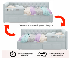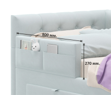 Угловая кровать-тахта Afelia (Афелия) 900 с двумя мягкими спинками и защитным бортиком выполнена из модной мебельной ткани – велюр. Это уникальный материал, который получается за счет сплетения пяти волокон одновременно. Ткань износостойкая, легко чиститься от загрязнений, практичная, эластичная, устойчивая к ультрафиолету.