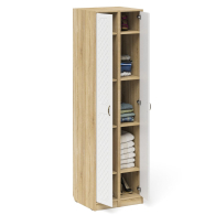 Комплектация состоит из двух узких пеналов объединенных в единый блок. Классический узкий пенал, за распашной дверью которого расположены 4 полки. В комплектации два пенала. Сторону открывания дверей Вы определяете при сборке, что расширяет возможности удобной меблировки прихожей.