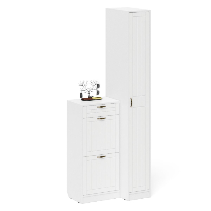 Комплектация состоит из тумбы для обуви и пенала. Классический узкий пенал, за распашной дверью которого расположены 4 полки. Сторону открывания двери Вы определяете при сборке, что расширяет возможности удобной меблировки прихожей. Высокая обувница оборудована ящиком для мелочей сверцу и двумя отделениями с откидными фасадами для обуви. Для фиксации откидных фасадов используется газлифт мебельный. Максимальная нагрузка составляет 5 кг.