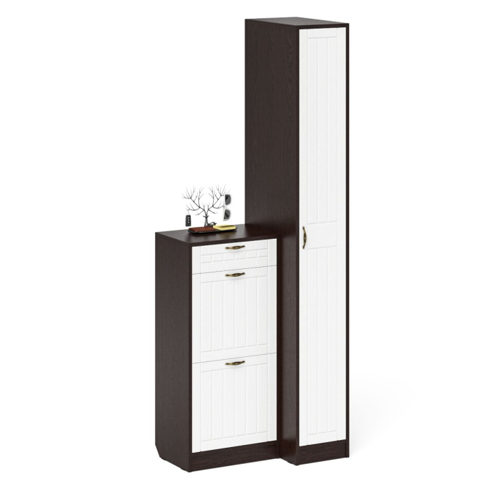 Комплектация состоит из тумбы для обуви и пенала. Классический узкий пенал, за распашной дверью которого расположены 4 полки. Сторону открывания двери Вы определяете при сборке, что расширяет возможности удобной меблировки прихожей. Высокая обувница оборудована ящиком для мелочей сверцу и двумя отделениями с откидными фасадами для обуви. Для фиксации откидных фасадов используется газлифт мебельный. Максимальная нагрузка составляет 5 кг.
