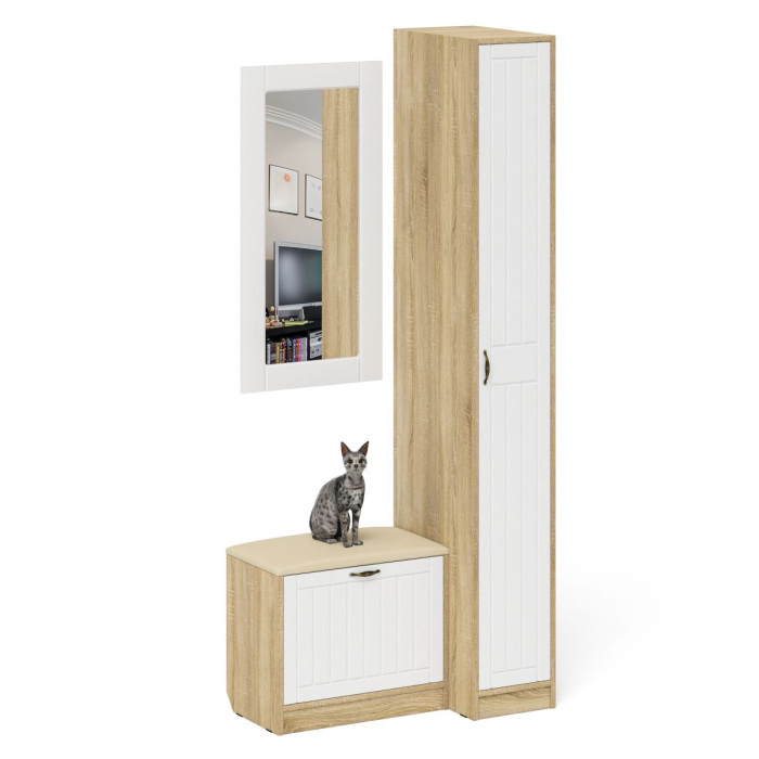 Комплектация состоит из обувницы с сиденьем, зеркала и пенала. Компактная маленькая обувница без полок за откидной дверкой. За откидной дверцей достаточно места для нескольких пар обуви. Обувница оборудована мягким сиденьем - ее можно использовать в качестве банкетки с комфортом обуваясь перед выходом. Для фиксации откидных фасадов используется газлифт мебельный. Максимальная нагрузка составляет 5 кг. Классический узкий пенал, за распашной дверью которого расположены 4 полки. Сторону открывания двери Вы определяете при сборке, что расширяет возможности удобной меблировки прихожей. Классическое прямоугольное зеркало в раме из МДФ. Крепления зеркала к стене в комплектацию не входит.