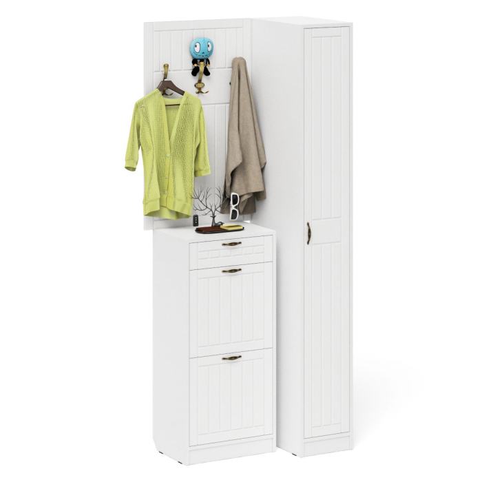 Комплектация состоит из высокой тумбы для обуви, навесной вешалки и узкого пенала. Высокая обувница оборудована ящиком для мелочей сверцу и двумя отделениями с откидными фасадами для обуви. Для фиксации откидных фасадов используется газлифт мебельный. Максимальная нагрузка составляет 5 кг. Классический узкий пенал, за распашной дверью которого расположены 4 полки. Сторону открывания двери Вы определяете при сборке, что расширяет возможности удобной меблировки прихожей. Классическая прямоугольная настенная вешалка с крючками. Оборудована тремя трехрожковыми крючками для одежды. Глубина вешалки - 16 мм., 9,3 см. - это глубина с учетом крючков. Крепления вешалки к стене в комплектацию не входит.