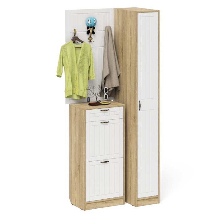 Комплектация состоит из высокой тумбы для обуви, навесной вешалки и узкого пенала. Высокая обувница оборудована ящиком для мелочей сверцу и двумя отделениями с откидными фасадами для обуви. Для фиксации откидных фасадов используется газлифт мебельный. Максимальная нагрузка составляет 5 кг. Классический узкий пенал, за распашной дверью которого расположены 4 полки. Сторону открывания двери Вы определяете при сборке, что расширяет возможности удобной меблировки прихожей. Классическая прямоугольная настенная вешалка с крючками. Оборудована тремя трехрожковыми крючками для одежды. Глубина вешалки - 16 мм., 9,3 см. - это глубина с учетом крючков. Крепления вешалки к стене в комплектацию не входит.