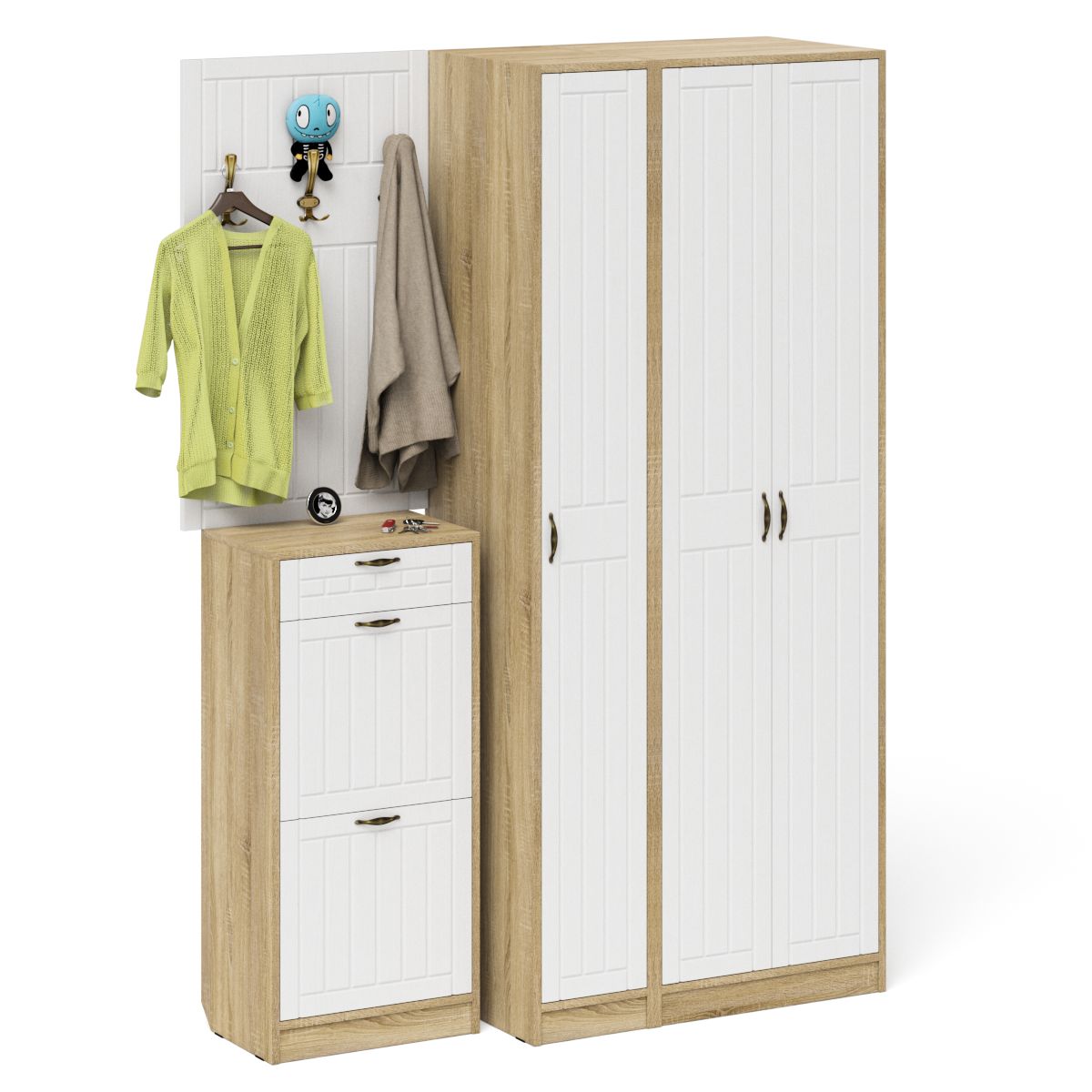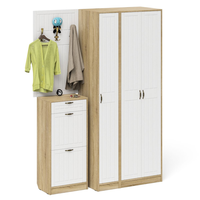 Комплектация состоит из шкафа для одежды и пенала объединенных в единый блок, высокой обувницы и навесной вешалки. Классический шкаф за распашными дверками которого расположены антресольная полка для головных уборов, горизонтальная штанка и нижняя ниша для обуви. Классический узкий пенал, за распашной дверью которого расположены 4 полки. Сторону открывания двери Вы определяете при сборке, что расширяет возможности удобной меблировки прихожей. Высокая обувница оборудована ящиком для мелочей сверцу и двумя отделениями с откидными фасадами для обуви. Для фиксации откидных фасадов используется газлифт мебельный. Максимальная нагрузка составляет 5 кг. Прямоугольная настенная вешалка с крючками. Оборудована тремя трехрожковыми крючками для одежды. Глубина вешалки - 16 мм., 9,3 см. - это глубина с учетом крючков. Крепления вешалки к стене в комплектацию не входит.