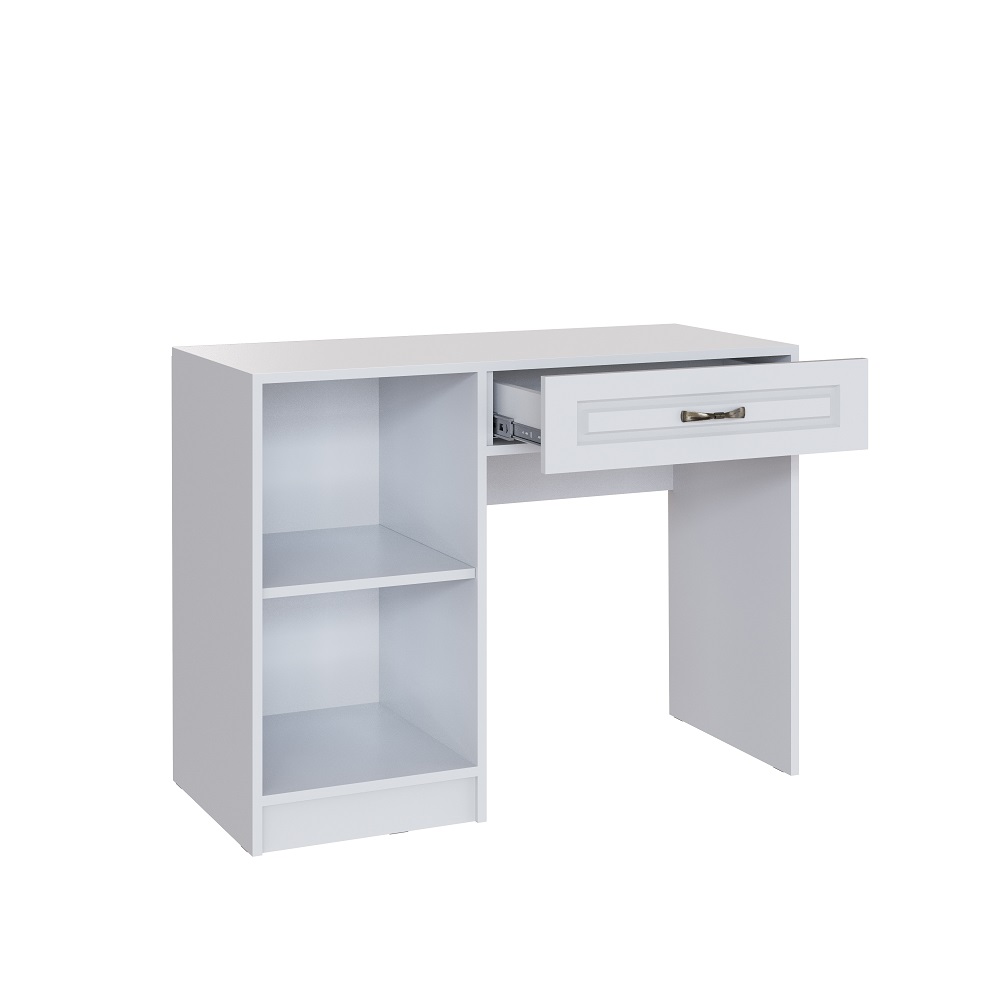 Интерьер классической спальни может быть дополнен элегантным туалетным столиком. Модуль оснащен выдвижным ящиком на шариковых направляющих плавного выдвижения и глухой створкой, за которой скрывается полка. Утонченные ручки не только красиво выглядят, но и удобны в ежедневном использовании.