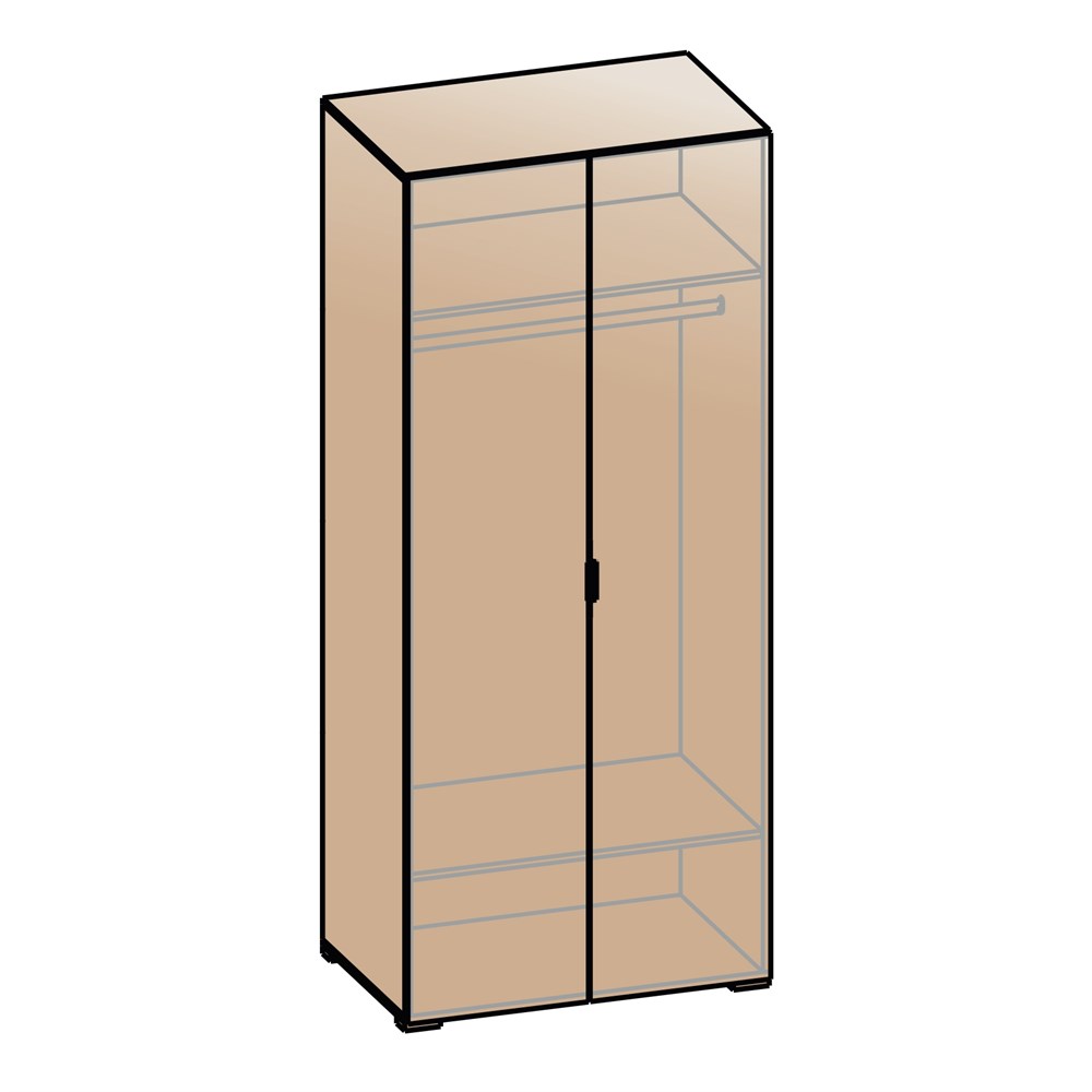 Прямой светлый распашной шкаф имеет две двери (две глухих) и штангу для хранения одежды на вешалках-плечиках.