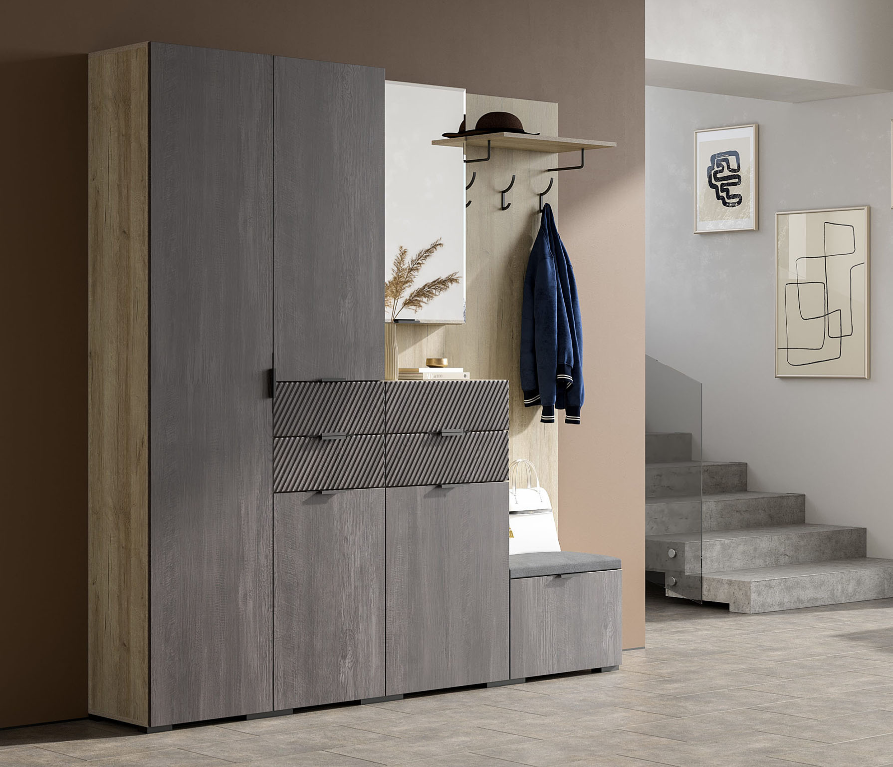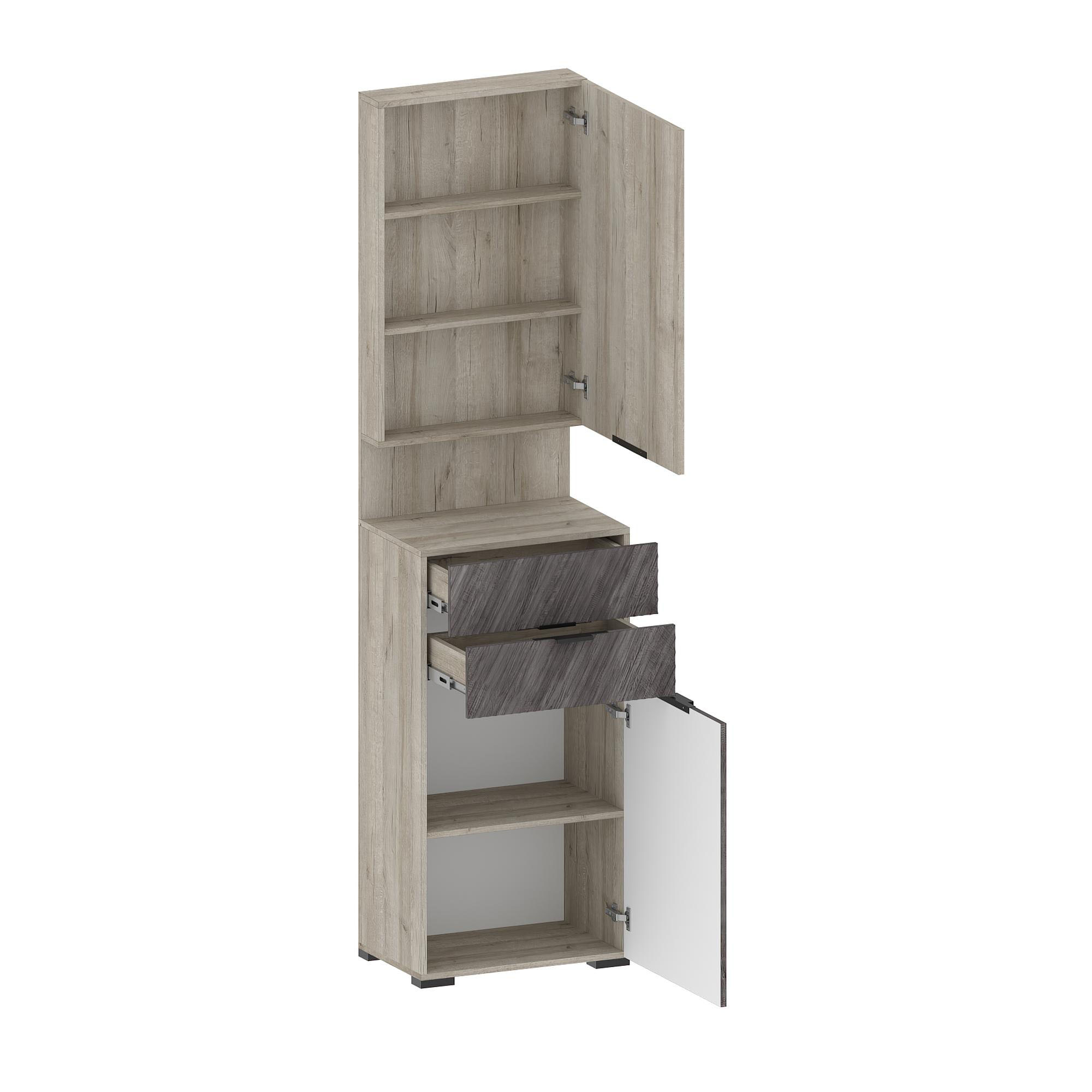 Шкаф-прихожая Шаде ШК-3442 имеет тумбу с двумя ящиками и полки с зеркалом.