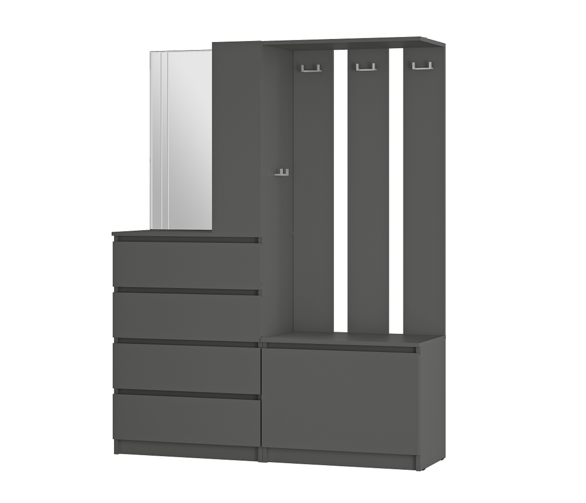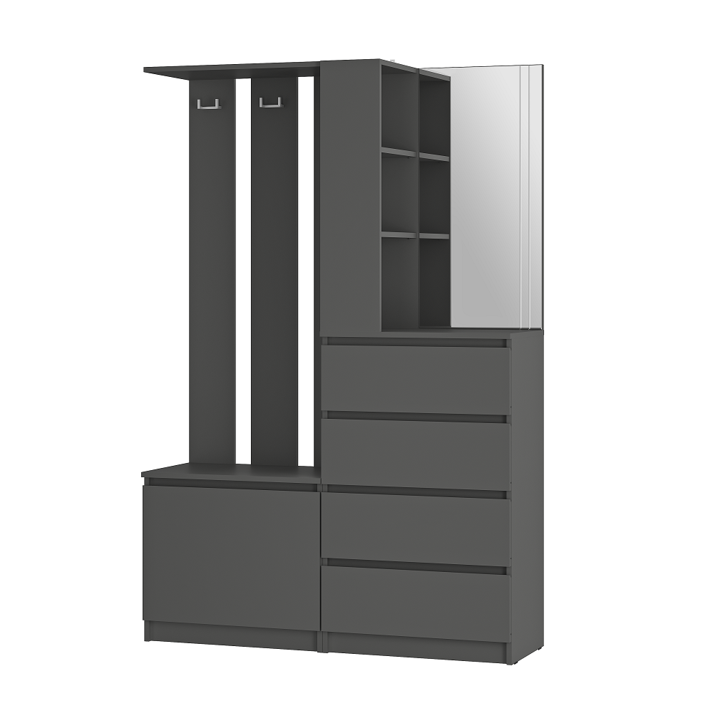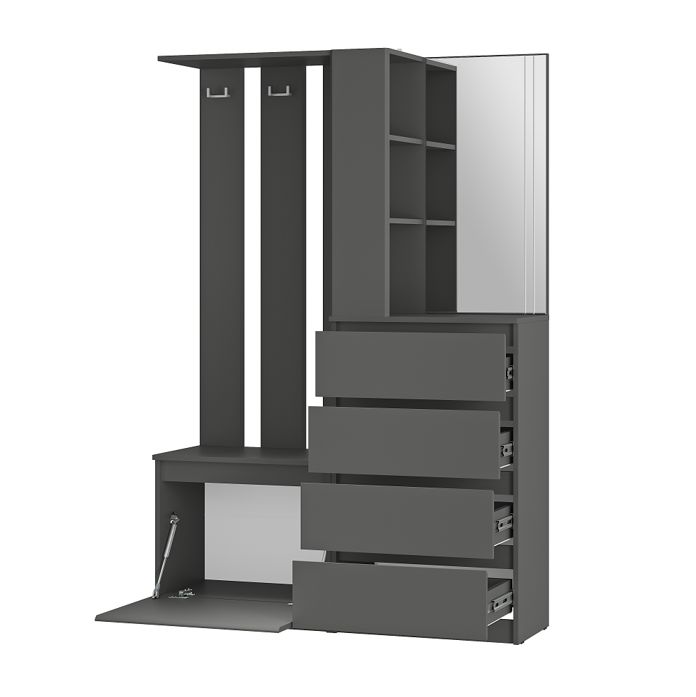 Прихожая Симпл ПР-04 - минималистичное готовое решение для современных интерьеров. Отличается практичным дизайном и максимальной функциональностью. Модуль состоит из 4-х выдвижных ящиков, тумбы с откидной створкой, зеркала, открытых полок, надежных крючков для верхней одежды и верхней полки под сезонные аксессуары.