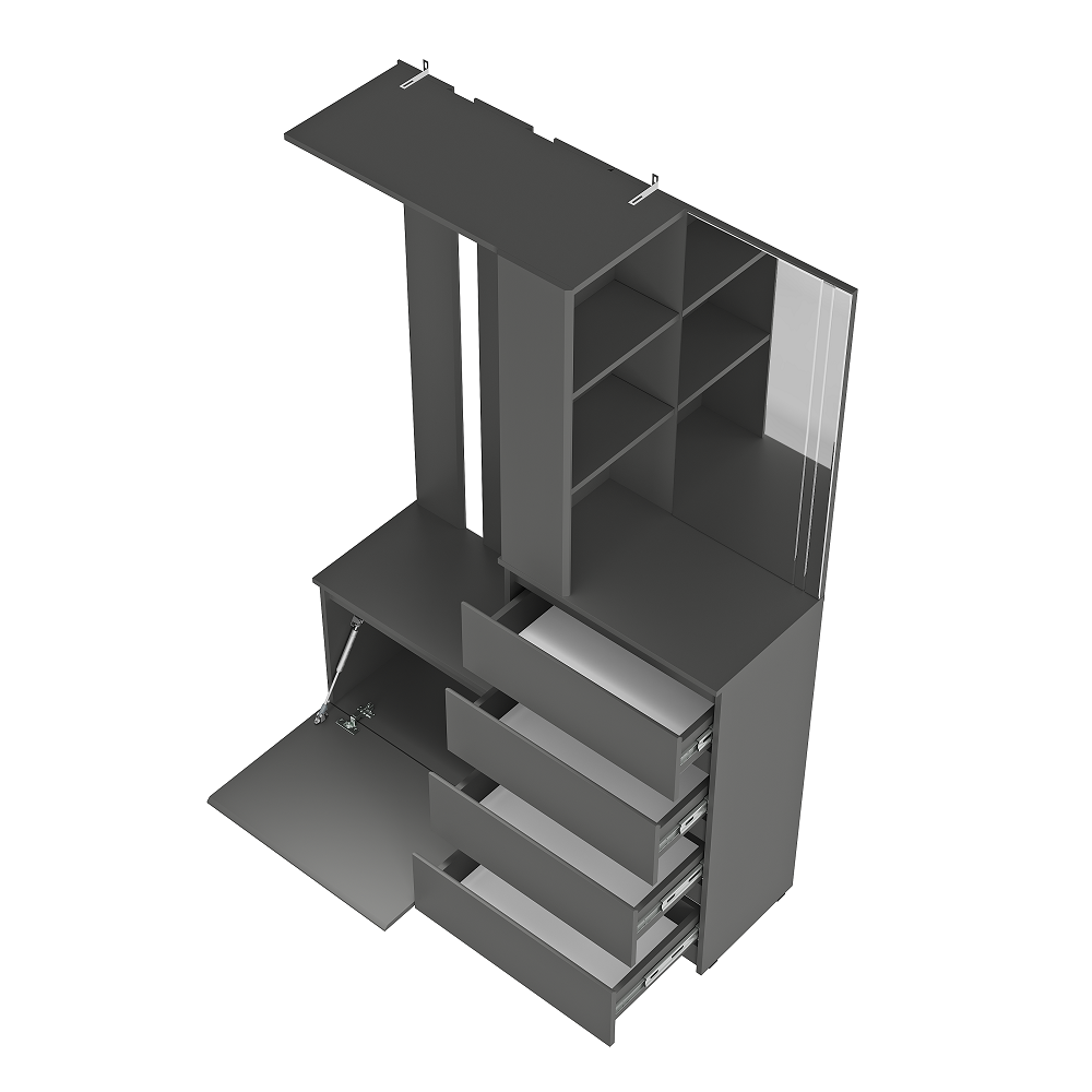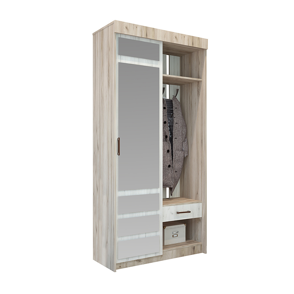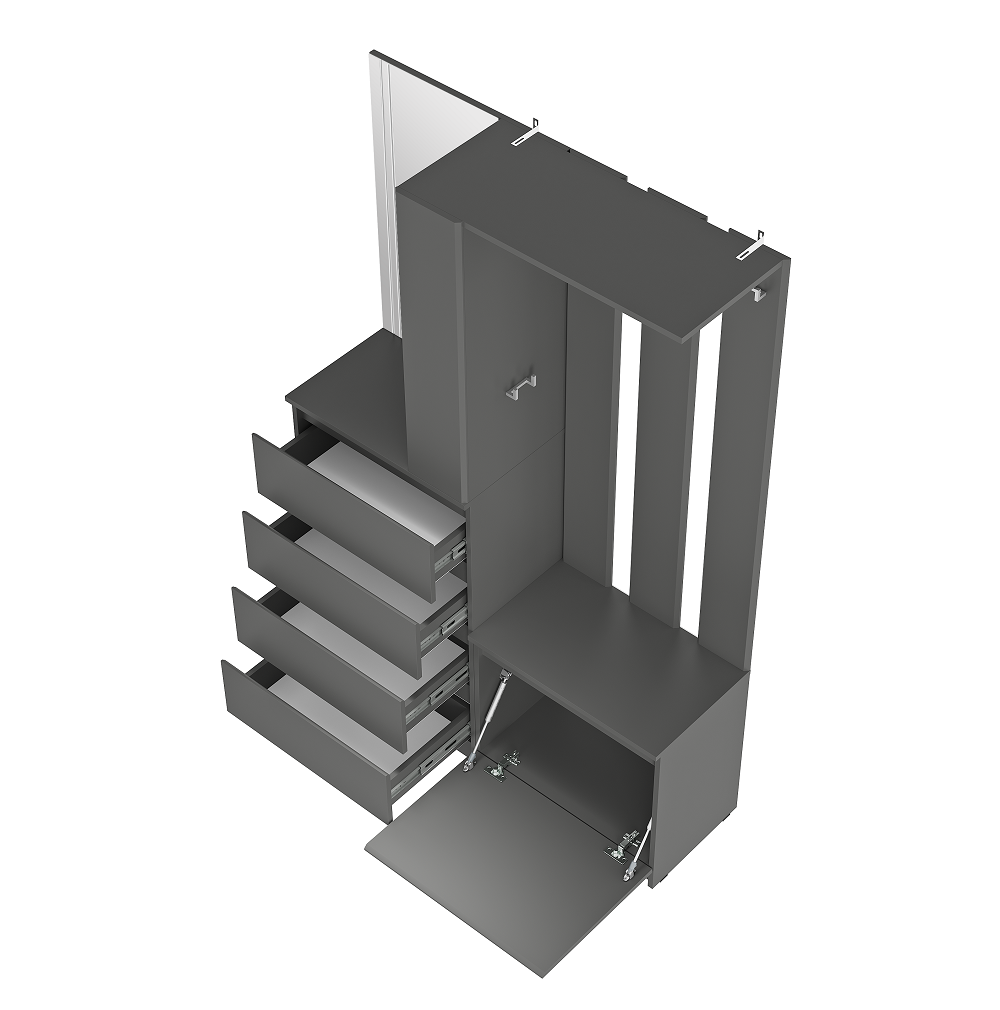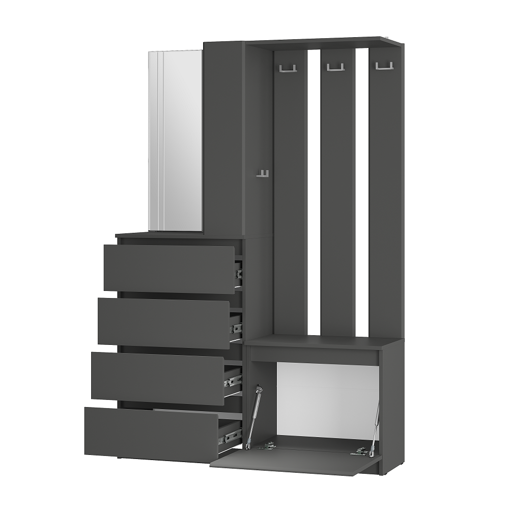 Прихожая Симпл ПР-04 - минималистичное готовое решение для современных интерьеров. Отличается практичным дизайном и максимальной функциональностью. Модуль состоит из 4-х выдвижных ящиков, тумбы с откидной створкой, зеркала, открытых полок, надежных крючков для верхней одежды и верхней полки под сезонные аксессуары.