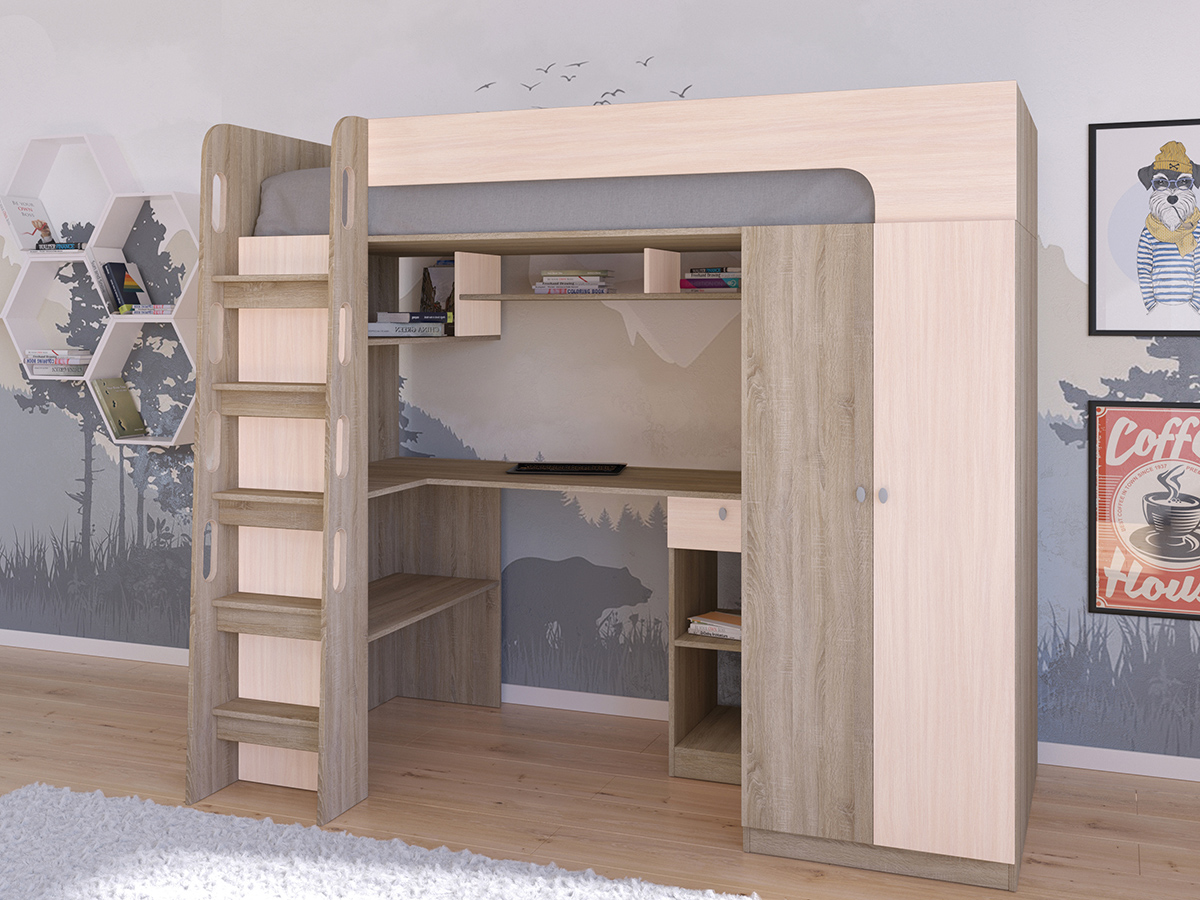 Кровать-чердак Астра 10 порадует Вас практичностью и удобством. Множество полочек позволят без труда разместить книги, поделки, тетради и прочие предметы творчества и учебы. Удобная угловая столешница не даст устать при выполнении домашнего задания или творческой работы. Продуманная конструкция ступеней лестницы позволит безопасно забраться на спальное место. А вместительный шкаф спрячет в своих недрах одежду ребенка.