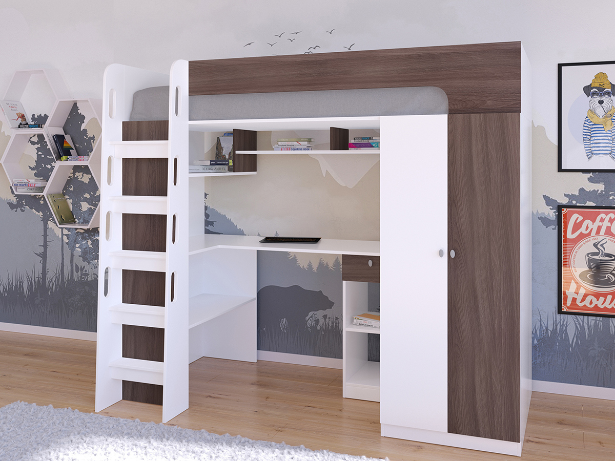 Кровать-чердак Астра 10 порадует Вас практичностью и удобством. Множество полочек позволят без труда разместить книги, поделки, тетради и прочие предметы творчества и учебы. Удобная угловая столешница не даст устать при выполнении домашнего задания или творческой работы. Продуманная конструкция ступеней лестницы позволит безопасно забраться на спальное место. А вместительный шкаф спрячет в своих недрах одежду ребенка.