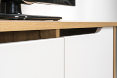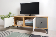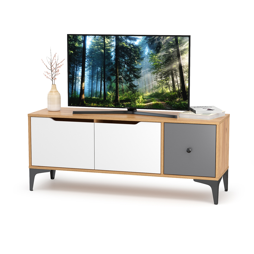 Тумба под ТВ Вайс 13.270.01 - современная тумба под ТВ придётся по вкусу любителям стиля лофт в оформлении интерьера. Сдержанный дизайн, сочетание тёплого цвета дерева и холодного цвета фасадов выдержаны в скандинавском стиле. Особый акцент данной модели - наличие металлических деталей, ручки на фасаде и опор из окрашенного металла. Наличие таких прочных ножек в конструкции тумбы значительно увеличивают её надёжность и долговечность. Этому же способствует и основной материал тумбы - ламинированная ДСП толщиной 16 мм. с кромкой ПВХ. Визуально плита ДСП цвета дуб золотой имеет тиснение, имитирующее спил натуральной древесины. Цветовое исполнение удачно подчёркивает это сходство. Дверки цвета милк софт выполнены из плиты МДФ. Поверхность фасадов дверок гладкая и матовая. Эти дверки лишены ручек, открытие их происходит за край, чему способствует форма фасадов. Конструктивно тумба разделена на три отделения каждое за распашными дверками. Ширина дверей одинакова. Закреплены дверки на четырёхшарнирных петлях. Опоры регулируются по высоте и наделены пластиковыми подпятниками. Тумба имеет универсальную сборку, дверки на фасаде можно расположить в удобном Вам порядке. Высокое качество материалов и компьютеризированный контроль производства гарантируют Вам долгую службу изделия. Поставляется тумба в разобранном виде, надёжно упакованной в гофрокартон, с приложенной подробной инструкцией по сборке.