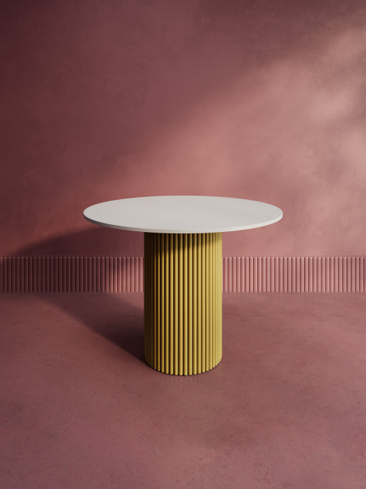 Дизайнерский круглый стол с металлическим трубчатым подстольем. Диаметр подстолья D400 мм. Столешница ЛДСП 16мм, диаметр D1000 мм. Стандартный вариант - матовая порошковая окраска в золотой, чёрный или белый цвет. На заказ возможно изготовление столешницы ЛДСП в индивидуальном цвете и размере под заказ.