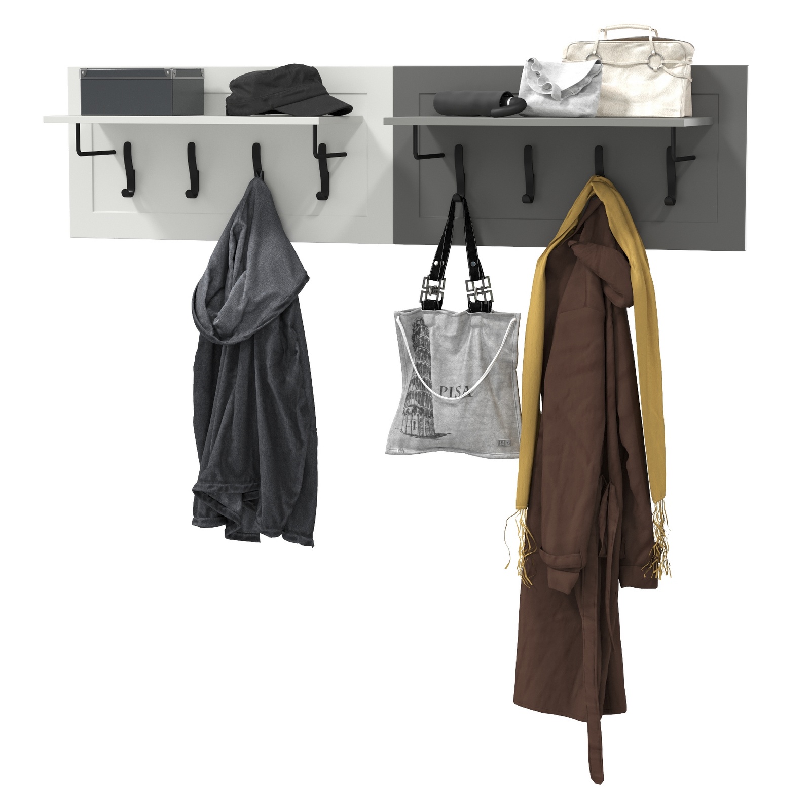 Комплектация состоит из двух вешалок Остин 15.12 объединеных в единую широкую конструкцию, что обеспечивает удобное размещение вашей верхней одежды. Широкая навесная вешалка оснащена восемью двухрожковыми крючками и двумя полками, предназначенными специально для головных уборов. Полки для головных уборов расположены над крючками и поддерживаются металлическими элементами. Максимальная нагрузка на каждый крючек - 1,5 кг, на полку - 5 кг.