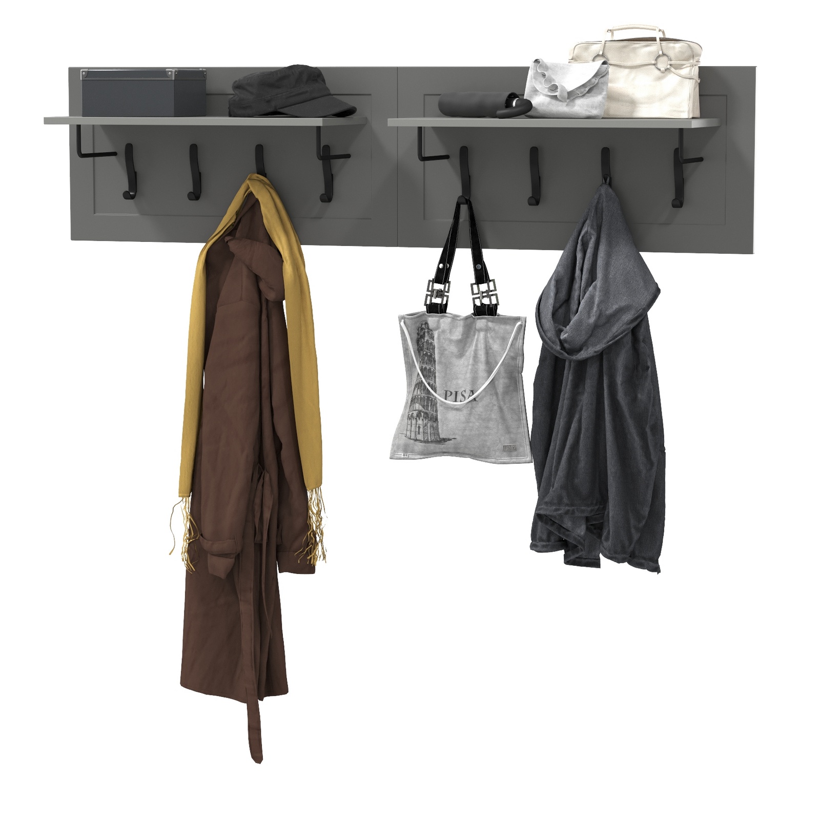 Комплектация состоит из двух вешалок Остин 15.12 объединеных в единую широкую конструкцию, что обеспечивает удобное размещение вашей верхней одежды. Широкая навесная вешалка оснащена восемью двухрожковыми крючками и двумя полками, предназначенными специально для головных уборов. Полки для головных уборов расположены над крючками и поддерживаются металлическими элементами. Максимальная нагрузка на каждый крючек - 1,5 кг, на полку - 5 кг.