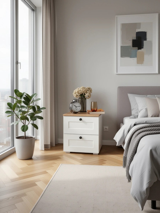 Тумба прикроватная с двумя выдвижными ящиками для хранения различных принадлежностей и мелких предметов. Скрытые направляющие выдвижных ящиков предназначены для обеспечения мягкого и плавного закрывания. Эти направляющие интегрированы таким образом, что они незаметны с внешней стороны, обеспечивая эстетичный внешний вид и комфортное использование мебели. Тумба оснащена регулируемыми опорами, выполненными из серого пластика.
