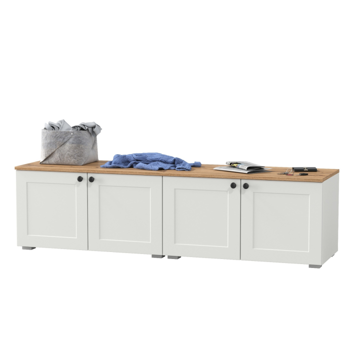 Комплектация состоит из двух тумб Остин 13.257, объединеных в единый блок. За распашными дверками каждой тумбы находятся два отделения, в каждом из которых имеются полки, расположенные по центру. В тумбе предусмотрены съемные полки, которые можно использовать специально для высокой обуви, обеспечивая удобное и оптимальное распределение. Максимальная нагрузка на каждую полку - 5 кг. Двери оснащены 4хшарнирными петлями без доводчиков, что обеспечивает простоту использования. Мебель оснащена регулируемыми опорами, выполненными из серого пластика. Лицевая фурнитура в виде черных аккуратных ручек. Изготовлена мебель из популярного материала - ламинированной ДСП 16 мм, торцы окромлены ПХВ плёнкой. Фасады выполнены из рамочного профиля из МДФ со вставками ДВПО с узором. Поставляется в разобранном виде, с комплектом фурнитуры, упакованная в 4-х слойный гофрокартон.