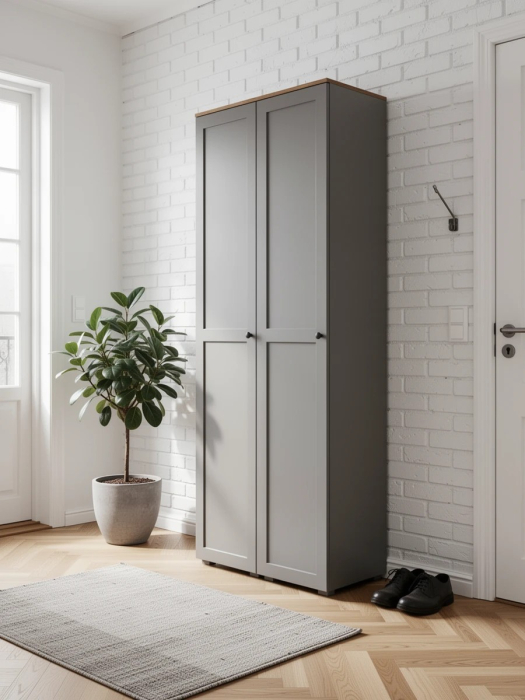 Комплектация состоит из двух пеналов Остин 13.225. Каждый пенал имеет распашную дверь и внутри расположено шесть полок. Максимальная нагрузка на каждую полку - 5 кг. Каждый шкаф-пенал имеет два варианта наполнения - 6 полок или штанга с антресольной и нижней полочками. 4 центральные полочки являются съемными и при необходимости, Вы оперативно можете переоборудовать пенал, установив штангу для одежды на плечиках. Универсальная сборка дверей - могут быть установлены как на левую, так и на правую сторону. Двери оснащены 4хшарнирными петлями без доводчиков, что обеспечивает простоту использования. Мебель оснащена регулируемыми опорами, выполненными из серого пластика. Лицевая фурнитура в виде черных аккуратных ручек. Изготовлена мебель из популярного материала - ламинированной ДСП 16 мм, торцы окромлены ПХВ плёнкой. Фасады выполнены из рамочного профиля из МДФ со вставками ДВПО с узором. Поставляется в разобранном виде, с комплектом фурнитуры, упакованная в 4-х слойный гофрокартон.