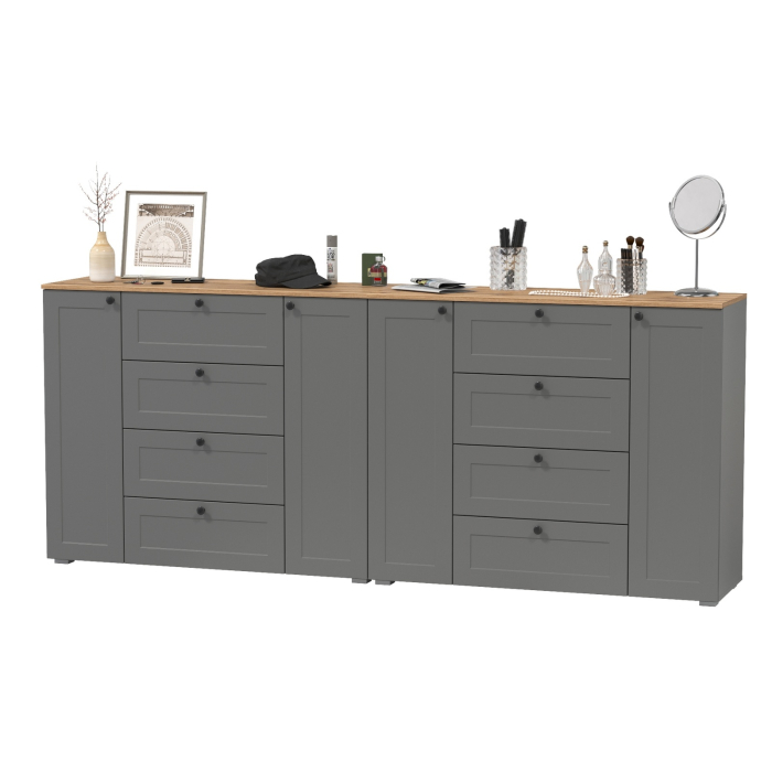 Комплектация состоит из двух комодов Остин 16.221. Каждый комод имеет три части - центральная - это 4 выдвижных ящика, по бокам расположены закрытые распашными дверками ниши с двумя полками в каждой. В комплектации 3 комода. В комоде предусмотрены съемные полки. Скрытые направляющие выдвижных ящиков. Двери оснащены 4хшарнирными петлями без доводчиков. Мебель оснащена регулируемыми опорами, выполненными из серого пластика. Лицевая фурнитура в виде черных аккуратных ручек. Изготовлена мебель из ЛДСП 16 мм, торцы окромлены ПХВ плёнкой. Фасады из рамочного профиля из МДФ со вставками ДВПО с узором. Поставляется в разобранном виде.
