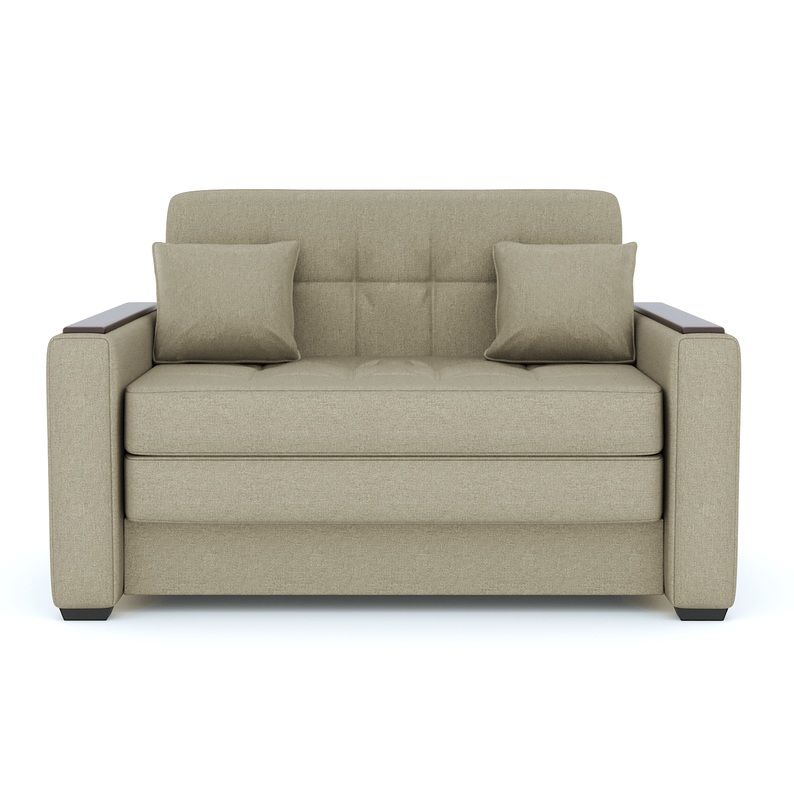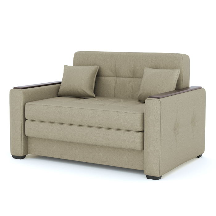 В стандартной модели установлены накладки цвета Орех, но при желание клиента накладки можно заменить на оттенок ""Дуб молочный"" или ""Венге"". Длина - 130, Высота - 81, глубина - 85, Длина, ширина спального места - 100*195, Механизм - Сунгирь, Наполнение - ППУ, Материал каркаса - брус сухой строганный, фанера, ДВП, Кол-во спальных мест - 1 спальное место, Вес - 50 кг, Глубина сиденья без подушек - 60,0 см Декоративные подушки - в комплекте 2 шт 40*40, Жесткость - средняя, Материал накладок - МДФ, Бельевой ящик - есть.