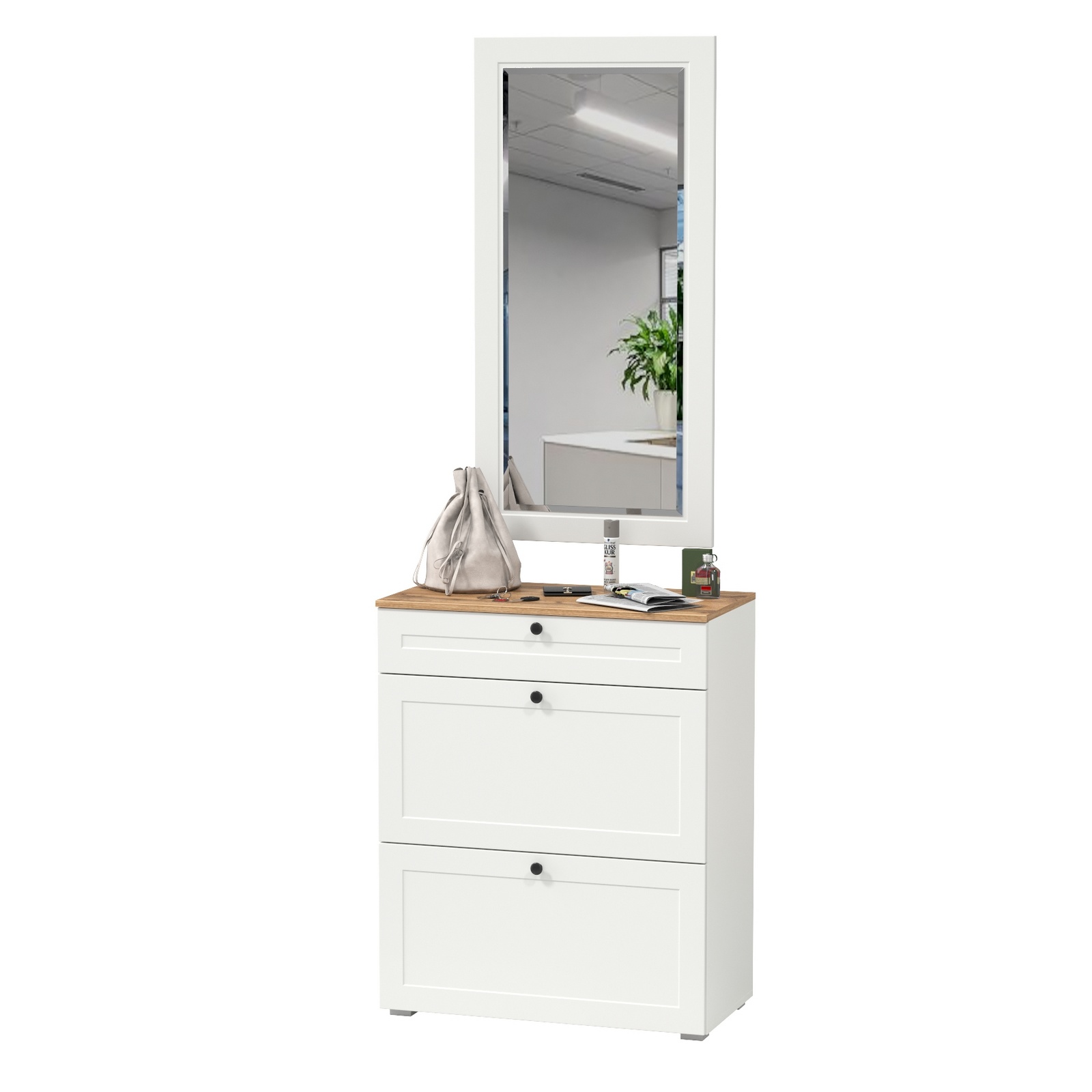 Комплектация состоит из тумбы для обуви Остин 16.121 и зеркала Остин 17.03. Тумба с выдвижным ящиком и 2 откидными дверками с полками для 12 пар обуви снизу. Каждая откидная дверь расчитана для хранения и размещения 6 пар невысокой обуви, что обеспечивает удобство и порядок в Вашей прихожей. Максимальная нагрузка на каждую полку и ящик - 3 кг. Классическое прямоугольное навесное зеркало на панели из рамочного профиля МДФ. Зеркальное полотно имеет декоративный скос фаски под углом по всему периметру полотна. Согласно Ваших запросов при установке зеркало возможно повесить как горизонтально, так и вертикально. Скрытые крепежи на задней поверхности и предусматривают выбор расположения зеркала. Скрытые направляющие выдвижного ящика предназначены для обеспечения мягкого и плавного закрывания. Эти направляющие интегрированы таким образом, что они незаметны с внешней стороны, обеспечивая эстетичный внешний вид и комфортное использование мебели. Двери оснащены 4хшарнирными петлями без доводчиков, что обеспечивает простоту использования. Мебель оснащена регулируемыми опорами, выполненными из серого пластика. Лицевая фурнитура в виде черных аккуратных ручек. Изготовлена мебель из популярного материала - ламинированной ДСП 16 мм, торцы окромлены ПХВ плёнкой. Фасады выполнены из рамочного профиля из МДФ со вставками ДВПО с узором. Поставляется в разобранном виде, с комплектом фурнитуры, упакованная в 4-х слойный гофрокартон.