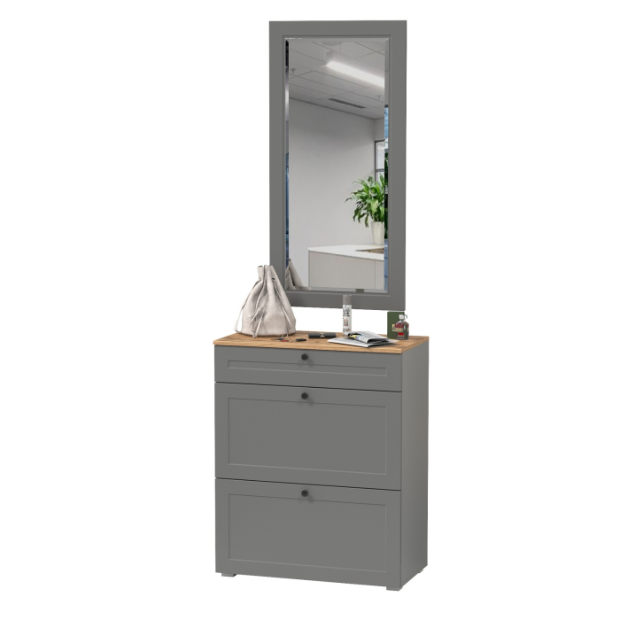 Комплектация состоит из тумбы для обуви Остин 16.121 и зеркала Остин 17.03. Тумба с выдвижным ящиком и 2 откидными дверками с полками для 12 пар обуви снизу. Каждая откидная дверь расчитана для хранения и размещения 6 пар невысокой обуви, что обеспечивает удобство и порядок в Вашей прихожей. Максимальная нагрузка на каждую полку и ящик - 3 кг. Классическое прямоугольное навесное зеркало на панели из рамочного профиля МДФ. Зеркальное полотно имеет декоративный скос фаски под углом по всему периметру полотна. Согласно Ваших запросов при установке зеркало возможно повесить как горизонтально, так и вертикально. Скрытые крепежи на задней поверхности и предусматривают выбор расположения зеркала. Скрытые направляющие выдвижного ящика предназначены для обеспечения мягкого и плавного закрывания. Эти направляющие интегрированы таким образом, что они незаметны с внешней стороны, обеспечивая эстетичный внешний вид и комфортное использование мебели. Двери оснащены 4хшарнирными петлями без доводчиков, что обеспечивает простоту использования. Мебель оснащена регулируемыми опорами, выполненными из серого пластика. Лицевая фурнитура в виде черных аккуратных ручек. Изготовлена мебель из популярного материала - ламинированной ДСП 16 мм, торцы окромлены ПХВ плёнкой. Фасады выполнены из рамочного профиля из МДФ со вставками ДВПО с узором. Поставляется в разобранном виде, с комплектом фурнитуры, упакованная в 4-х слойный гофрокартон.