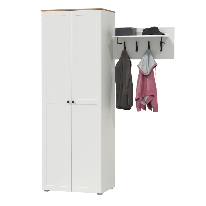 Комплектация состоит из шкафа Остин 13.224 и вешалки Остин 15.12. Шкаф с двумя распашными дверьми предлагает удобное решение для хранения вашей одежды и аксессуаров. В его верхней части устроена антресольная полка. Под ней горизонтальная штанга для одежды на плечиках обеспечивает удобное их размещение. Полка и ниша внизу добавляют дополнительное пространство для аксессуаров или других вещей. Максимальная нагрузка на каждую полку - 5 кг. Навесная вешалка с 4 двухрожковыми крючками и полкой для головных уборов. Полка для головных уборов расположена над крючками и поддерживается двумя металлическими элементами. Максимальная нагрузка на каждый крючек - 1,5 кг, на полку - 5 кг. Вешалка Остин 15.12 рассчитана для малогаборитных помещений (прихожих, балконов), по приемлемой цене. Двери оснащены 4хшарнирными петлями без доводчиков, что обеспечивает простоту использования. Мебель оснащена регулируемыми опорами, выполненными из серого пластика. Лицевая фурнитура в виде черных аккуратных ручек. Изготовлена мебель из популярного материала - ламинированной ДСП 16 мм, торцы окромлены ПХВ плёнкой. Фасады выполнены из рамочного профиля из МДФ со вставками ДВПО с узором. Поставляется в разобранном виде, с комплектом фурнитуры, упакованная в 4-х слойный гофрокартон.