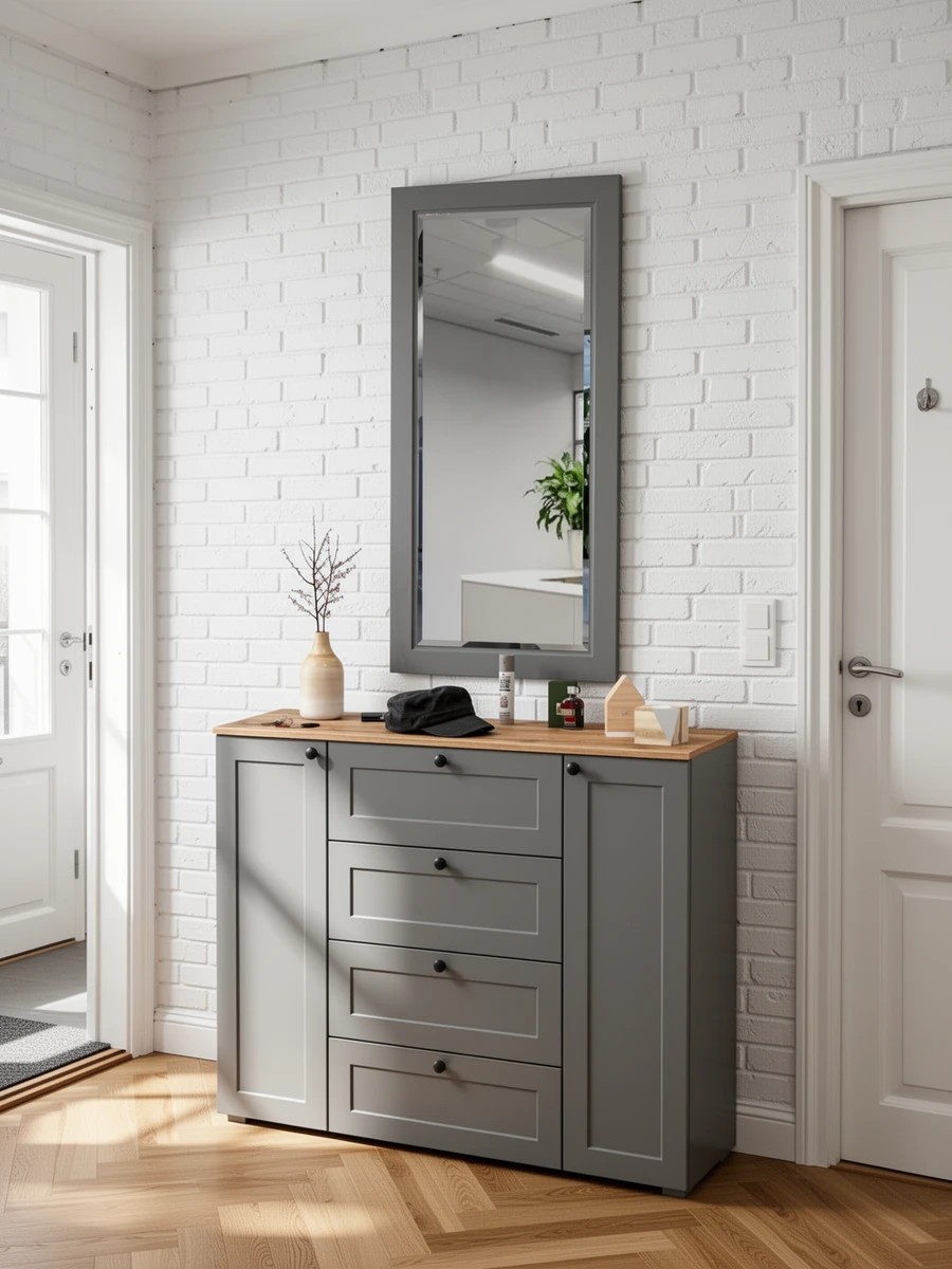 Комплектация состоит из комода Остин 16.221 и зеркала Остин 17.03. Комод имеет три части - центральная - это 4 выдвижных ящика, по бокам расположены закрытые распашными дверками ниши с двумя полками в каждой. В комоде предусмотрены съемные полки. Классическое прямоугольное навесное зеркало на панели из рамочного профиля МДФ. Зеркальное полотно имеет декоративный скос фаски под углом по всему периметру полотна. Согласно Ваших запросов при установке зеркало возможно повесить как горизонтально, так и вертикально. Скрытые крепежи на задней поверхности и предусматривают выбор расположения зеркала. Скрытые направляющие выдвижных ящиков предназначены для обеспечения мягкого и плавного закрывания. Эти направляющие интегрированы таким образом, что они незаметны с внешней стороны, обеспечивая эстетичный внешний вид и комфортное использование мебели. Двери оснащены 4хшарнирными петлями без доводчиков, что обеспечивает простоту использования. Мебель оснащена регулируемыми опорами, выполненными из серого пластика. Лицевая фурнитура в виде черных аккуратных ручек. Изготовлена мебель из популярного материала - ламинированной ДСП 16 мм, торцы окромлены ПХВ плёнкой. Фасады выполнены из рамочного профиля из МДФ со вставками ДВПО с узором. Поставляется в разобранном виде, с комплектом фурнитуры, упакованная в 4-х слойный гофрокартон.