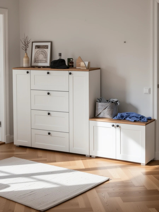 Комплектация состоит из комода Остин 16.221 и тумбы Остин 13.257. Комод имеет три части - центральная - это 4 выдвижных ящика, по бокам расположены закрытые распашными дверками ниши с двумя полками в каждой. В комоде предусмотрены съемные полки. За распашными дверками тумбы находятся два отделения, в каждом из которых имеются полки, расположенные по центру. В тумбе предусмотрены съемные полки, которые можно использовать специально для высокой обуви, обеспечивая удобное и оптимальное распределение. Скрытые направляющие выдвижных ящиков предназначены для обеспечения мягкого и плавного закрывания. Эти направляющие интегрированы таким образом, что они незаметны с внешней стороны, обеспечивая эстетичный внешний вид и комфортное использование мебели. Двери оснащены 4хшарнирными петлями без доводчиков, что обеспечивает простоту использования. Мебель оснащена регулируемыми опорами, выполненными из серого пластика. Лицевая фурнитура в виде черных аккуратных ручек. Изготовлена мебель из популярного материала - ламинированной ДСП 16 мм, торцы окромлены ПХВ плёнкой. Фасады выполнены из рамочного профиля из МДФ со вставками ДВПО с узором. Поставляется в разобранном виде, с комплектом фурнитуры, упакованная в 4-х слойный гофрокартон.