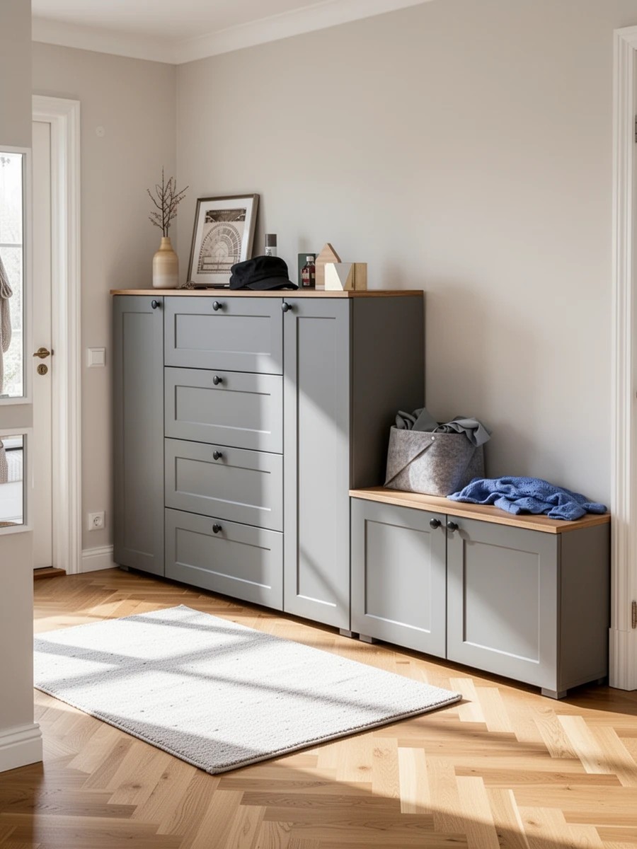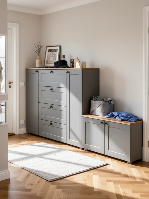 Комплектация состоит из комода Остин 16.221 и тумбы Остин 13.257. Комод имеет три части - центральная - это 4 выдвижных ящика, по бокам расположены закрытые распашными дверками ниши с двумя полками в каждой. В комоде предусмотрены съемные полки. За распашными дверками тумбы находятся два отделения, в каждом из которых имеются полки, расположенные по центру. В тумбе предусмотрены съемные полки, которые можно использовать специально для высокой обуви, обеспечивая удобное и оптимальное распределение. Скрытые направляющие выдвижных ящиков предназначены для обеспечения мягкого и плавного закрывания. Эти направляющие интегрированы таким образом, что они незаметны с внешней стороны, обеспечивая эстетичный внешний вид и комфортное использование мебели. Двери оснащены 4хшарнирными петлями без доводчиков, что обеспечивает простоту использования. Мебель оснащена регулируемыми опорами, выполненными из серого пластика. Лицевая фурнитура в виде черных аккуратных ручек. Изготовлена мебель из популярного материала - ламинированной ДСП 16 мм, торцы окромлены ПХВ плёнкой. Фасады выполнены из рамочного профиля из МДФ со вставками ДВПО с узором. Поставляется в разобранном виде, с комплектом фурнитуры, упакованная в 4-х слойный гофрокартон.