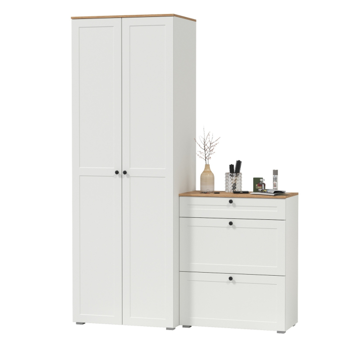 Комплектация состоит из шкафа Остин 13.224 и тумбы для обуви Остин 16.121. Шкаф с двумя распашными дверьми предлагает удобное решение для хранения вашей одежды и аксессуаров. В его верхней части устроена антресольная полка. Под ней горизонтальная штанга для одежды на плечиках, снизу полка и ниша. Макс. нагрузка на каждую полку - 5 кг. Тумба с выдвижным ящиком и 2 откидными дверками с полками для 12 пар обуви снизу. Каждая откидная дверь расcчитана для 6 пар невысокой обуви. Макс. нагрузка на каждую полку и ящик - 3 кг. Скрытые направляющие выдвижных ящиков. Двери оснащены 4хшарнирными петлями без доводчиков. Мебель оснащена регулируемыми опорами, выполненными из серого пластика. Лицевая фурнитура в виде черных аккуратных ручек. Изготовлена мебель из ЛДСП 16 мм, торцы окромлены ПХВ плёнкой. Фасады из рамочного профиля из МДФ со вставками ДВПО с узором. Поставляется в разобранном виде.