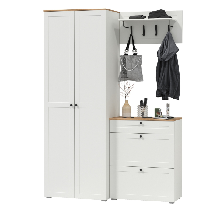 Комплектация состоит из шкафа Остин 13.224, тумбы для обуви Остин 16.121 и вешалки Остин 15.12. Шкаф с двумя распашными дверьми предлагает удобное решение для хранения вашей одежды и аксессуаров. В его верхней части устроена антресольная полка. Под ней горизонтальная штанга для одежды на плечиках, снизу полка и ниша. Макс. нагрузка на каждую полку - 5 кг. Тумба с выдвижным ящиком и 2 откидными дверками с полками для 12 пар обуви снизу. Каждая откидная дверь расчитана для 6 пар невысокой обуви. Макс. нагрузка на каждую полку и ящик - 3 кг. Навесная вешалка с 4 двухрожковыми крючками и полкой для головных уборов. Полка для головных уборов расположена над крючками и поддерживается двумя металлическими элементами. Макс. нагрузка на каждый крючек - 1,5 кг, на полку - 5 кг. Скрытые направляющие выдвижных ящиков. Двери оснащены 4хшарнирными петлями без доводчиков. Мебель оснащена регулируемыми опорами, выполненными из серого пластика. Лицевая фурнитура в виде черных аккуратных ручек. Изготовлена мебель из ЛДСП 16 мм, торцы окромлены ПХВ плёнкой. Фасады из рамочного профиля из МДФ со вставками ДВПО с узором. Поставляется в разобранном виде.