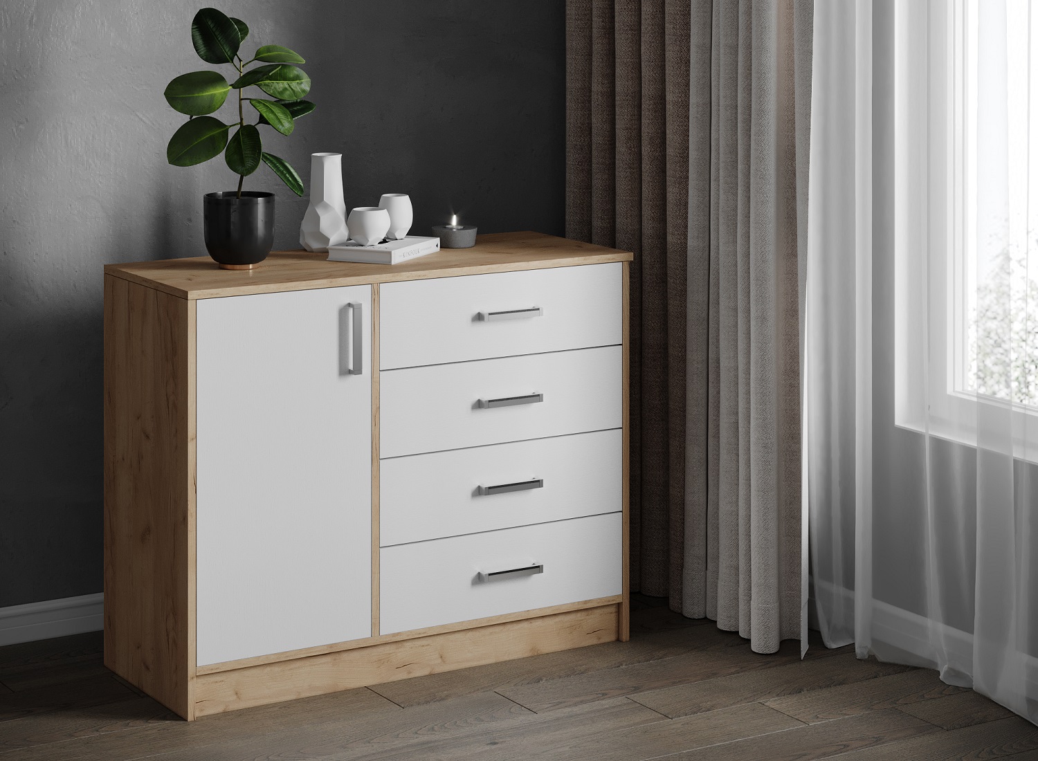 — Комод с двумя секциями: отделение с распашным фасадом и выдвижные ящики