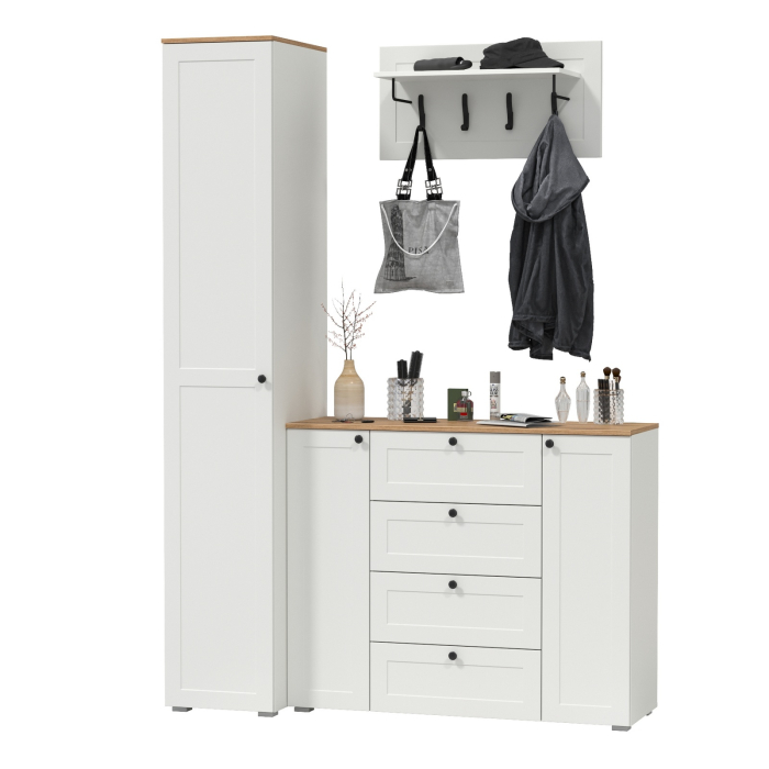 Комплектация состоит из пенала Остин 13.225, комода Остин 16.221 и вешалки Остин 15.12. Пенал имеет распашную дверь и внутри расположено шесть полок. Макс. нагрузка на каждую полку - 5 кг. Пенал имеет два варианта наполнения - 6 полок или штанга с антресольной и нижней полочками. 4 центральные полочки являются съемными и при необходимости, Вы оперативно можете переоборудовать пенал, установив штангу для одежды на плечиках. Универсальная сборка двери - может быть установлена как на левую, так и на правую сторону. Комод имеет три части - центральная - это 4 выдвижных ящика, по бокам расположены закрытые распашными дверками ниши с двумя полками в каждой. В комоде предусмотрены съемные полки. Навесная вешалка с 4 двухрожковыми крючками и полкой для головных уборов. Полка для головных уборов расположена над крючками и поддерживается двумя металлическими элементами. Макс. нагрузка на каждый крючек - 1,5 кг, на полку - 5 кг. Скрытые направляющие выдвижных ящиков. Двери оснащены 4хшарнирными петлями без доводчиков. Мебель оснащена регулируемыми опорами, выполненными из серого пластика. Лицевая фурнитура в виде черных аккуратных ручек. Изготовлена мебель из ЛДСП 16 мм, торцы окромлены ПХВ плёнкой. Фасады из рамочного профиля из МДФ со вставками ДВПО с узором. Поставляется в разобранном виде.