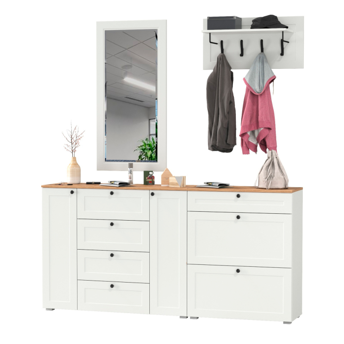 Комплектация состоит из комода Остин 16.221, тумбы для обуви Остин 16.121, вешалки Остин 15.12 и зеркала Остин 17.03. Комод имеет три части - центральная - это 4 выдвижных ящика, по бокам расположены закрытые распашными дверками ниши с двумя полками в каждой. В комоде предусмотрены съемные полки. Тумба с выдвижным ящиком и 2 откидными дверками с полками для 12 пар обуви снизу. Каждая откидная дверь расчитана для 6 пар невысокой обуви. Макс. нагрузка на каждую полку и ящик - 3 кг. Навесная вешалка с 4 двухрожковыми крючками и полкой для головных уборов. Полка для головных уборов расположена над крючками и поддерживается двумя металлическими элементами. Макс. нагрузка на каждый крючек - 1,5 кг, на полку - 5 кг. Навесное зеркало на панели из рамочного профиля МДФ. Зеркальное полотно имеет декоративный скос. Зеркало возможно повесить как горизонтально, так и вертикально. Скрытые крепежи зеркала. Скрытые направляющие выдвижных ящиков. Двери оснащены 4хшарнирными петлями без доводчиков. Мебель оснащена регулируемыми опорами, выполненными из серого пластика. Лицевая фурнитура в виде черных аккуратных ручек. Изготовлена мебель из ЛДСП 16 мм, торцы окромлены ПХВ плёнкой. Фасады из рамочного профиля из МДФ со вставками ДВПО с узором. Поставляется в разобранном виде.