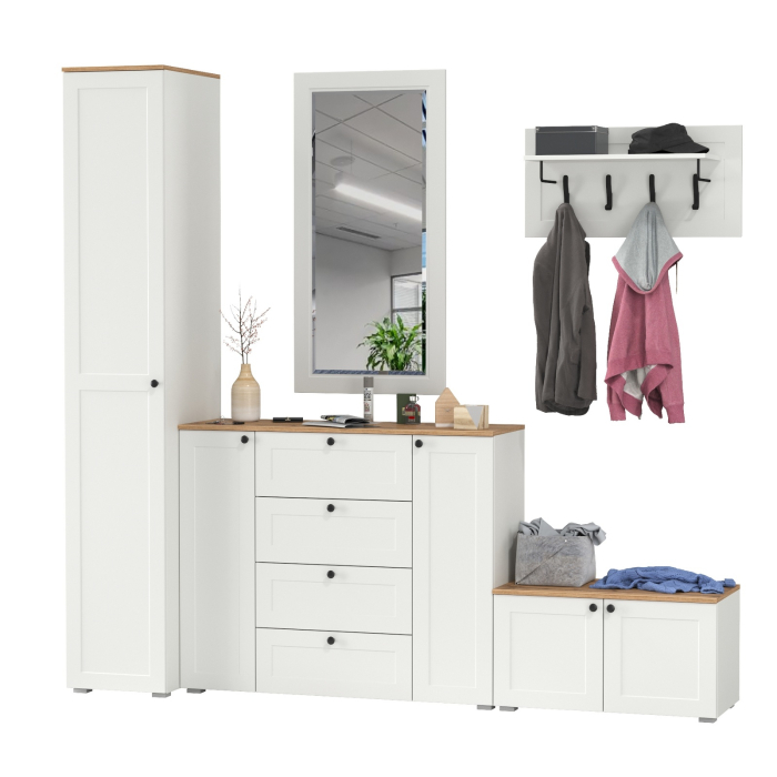Комплектация состоит из пенала Остин 13.225, комода Остин 16.221, тумбы Остин 13.257, вешалки Остин 15.12 и зеркала Остин 17.03. Пенал имеет распашную дверь и внутри расположено шесть полок. Макс. нагрузка на каждую полку - 5 кг. Пенал имеет два варианта наполнения - 6 полок или штанга с антресольной и нижней полочками. 4 центральные полочки являются съемными и при необходимости, Вы оперативно можете переоборудовать пенал, установив штангу для одежды на плечиках. Универсальная сборка двери - может быть установлена как на левую, так и на правую сторону. Комод имеет три части - центральная - это 4 выдвижных ящика, по бокам расположены закрытые распашными дверками ниши с двумя полками в каждой. В комоде предусмотрены съемные полки. За распашными дверками тумбы находятся два отделения, в каждом из которых имеются полки, расположенные по центру. В тумбе съемные полки для высокой обуви. Навесная вешалка с 4 двухрожковыми крючками и полкой для головных уборов. Полка для головных уборов над крючками и поддерживается 2 металл. элементами. Макс. нагрузка на каждый крючек - 1,5 кг, на полку - 5 кг. Навесное зеркало на панели из рамочного профиля МДФ. Зеркальное полотно имеет декоративный скос. Зеркало возможно повесить как горизонтально, так и вертикально. Скрытые крепежи зеркала. Скрытые направляющие выдвижных ящиков. Двери оснащены 4хшарнирными петлями без доводчиков. Мебель оснащена регулируемыми опорами из серого пластика. Лицевая фурнитура в виде черных аккуратных ручек. Изготовлена мебель из ЛДСП 16 мм, торцы окромлены ПХВ плёнкой. Фасады из рамочного профиля из МДФ со вставками ДВПО с узором. Поставляется в разобранном виде.