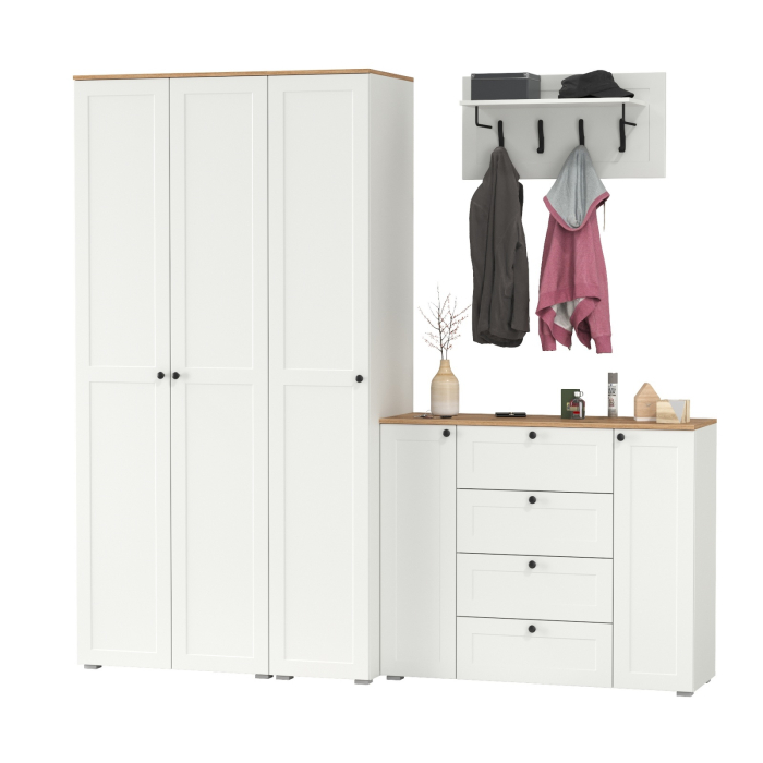 Комплектация состоит из пенала Остин 13.225, шкафа Остин 13.224, комода Остин 16.221 и вешалки Остин 15.12. Пенал имеет распашную дверь и внутри расположено шесть полок. Макс. нагрузка на каждую полку - 5 кг. Пенал имеет два варианта наполнения - 6 полок или штанга с антресольной и нижней полочками. 4 центральные полочки являются съемными и при необходимости, Вы оперативно можете переоборудовать пенал, установив штангу для одежды на плечиках. Универсальная сборка двери - может быть установлена как на левую, так и на правую сторону. Шкаф с двумя распашными дверьми предлагает удобное решение для хранения вашей одежды и аксессуаров. В его верхней части устроена антресольная полка. Под ней горизонтальная штанга для одежды на плечиках, снизу полка и ниша. Макс. нагрузка на каждую полку - 5 кг. Комод имеет три части - центральная - это 4 выдвижных ящика, по бокам расположены закрытые распашными дверками ниши с двумя полками в каждой. В комоде предусмотрены съемные полки. Навесная вешалка с 4 двухрожковыми крючками и полкой для головных уборов. Полка для головных уборов над крючками и поддерживается 2 металл. элементами. Макс. нагрузка на каждый крючек - 1,5 кг, на полку - 5 кг. Скрытые направляющие выдвижных ящиков. Двери оснащены 4хшарнирными петлями без доводчиков. Мебель оснащена регулируемыми опорами из серого пластика. Лицевая фурнитура в виде черных аккуратных ручек. Изготовлена мебель из ЛДСП 16 мм, торцы окромлены ПХВ плёнкой. Фасады из рамочного профиля из МДФ со вставками ДВПО с узором. Поставляется в разобранном виде.