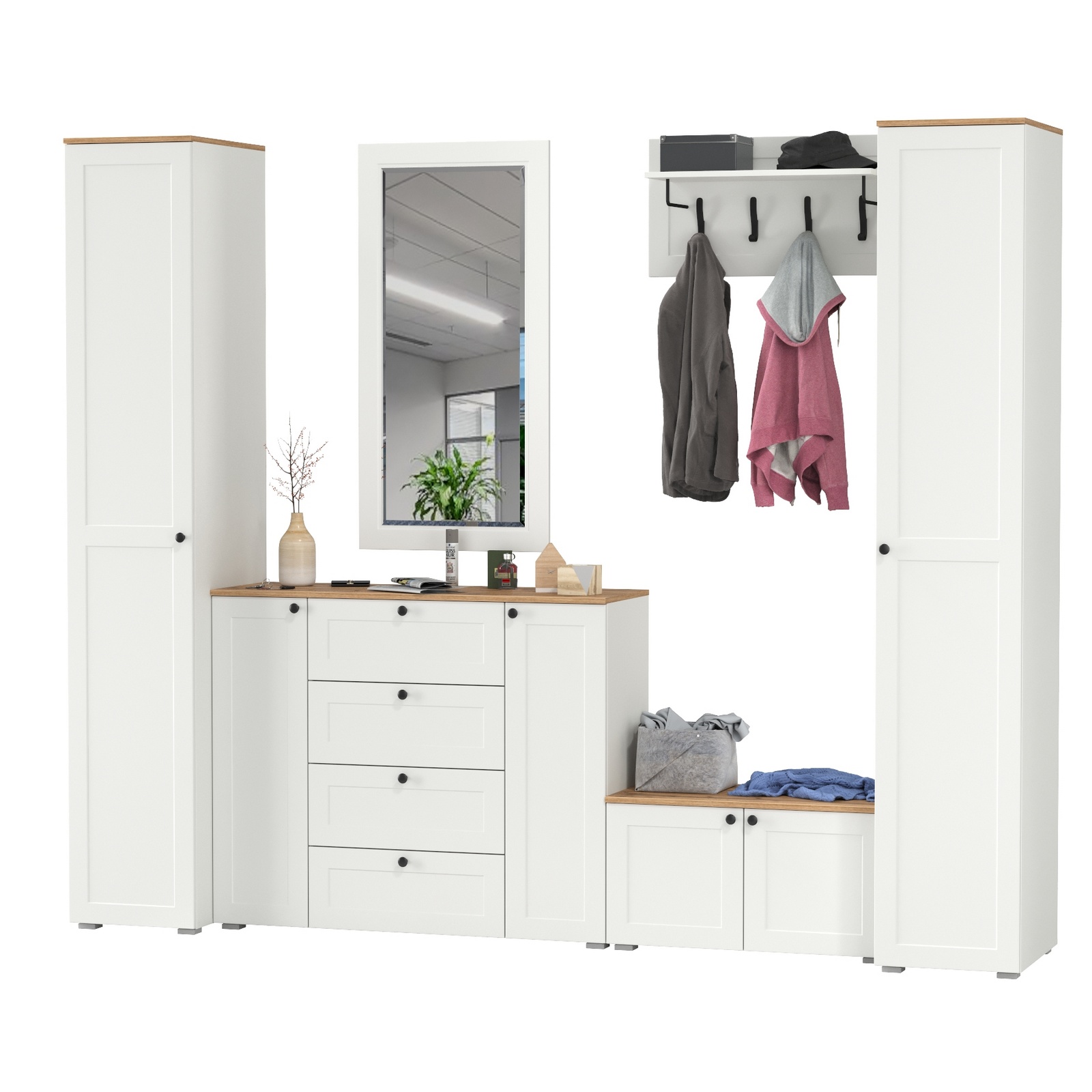 Комплектация состоит из двух пеналов Остин 13.225, комода Остин 16.221, тумбы Остин 13.257, вешалки Остин 15.12 и зеркала Остин 17.03. Каждый пенал имеет распашную дверь и внутри расположено шесть полок. Макс. нагрузка на каждую полку - 5 кг. Каждый шкаф-пенал имеет два варианта наполнения - 6 полок или штанга с антресольной и нижней полочками. 4 центральные полочки являются съемными и при необходимости, Вы оперативно можете переоборудовать пенал, установив штангу для одежды на плечиках. Универсальная сборка дверей - могут быть установлены как на левую, так и на правую сторону. Комод имеет три части - центральная - это 4 выдвижных ящика, по бокам расположены закрытые распашными дверками ниши с двумя полками в каждой. В комоде предусмотрены съемные полки. За распашными дверками тумбы находятся два отделения, в каждом из которых имеются полки, расположенные по центру. В тумбе съемные полки для высокой обуви. Навесная вешалка с 4 двухрожковыми крючками и полкой для головных уборов. Полка для головных уборов над крючками и поддерживается 2 металл. элементами. Макс. нагрузка на каждый крючек - 1,5 кг, на полку - 5 кг. Навесное зеркало на панели из рамочного профиля МДФ. Зеркальное полотно имеет декоративный скос. Зеркало возможно повесить как горизонтально, так и вертикально. Скрытые крепежи зеркала. Скрытые направляющие выдвижных ящиков. Двери оснащены 4хшарнирными петлями без доводчиков. Мебель оснащена регулируемыми опорами из серого пластика. Лицевая фурнитура в виде черных аккуратных ручек. Изготовлена мебель из ЛДСП 16 мм, торцы окромлены ПХВ плёнкой. Фасады из рамочного профиля из МДФ со вставками ДВПО с узором. Поставляется в разобранном виде.