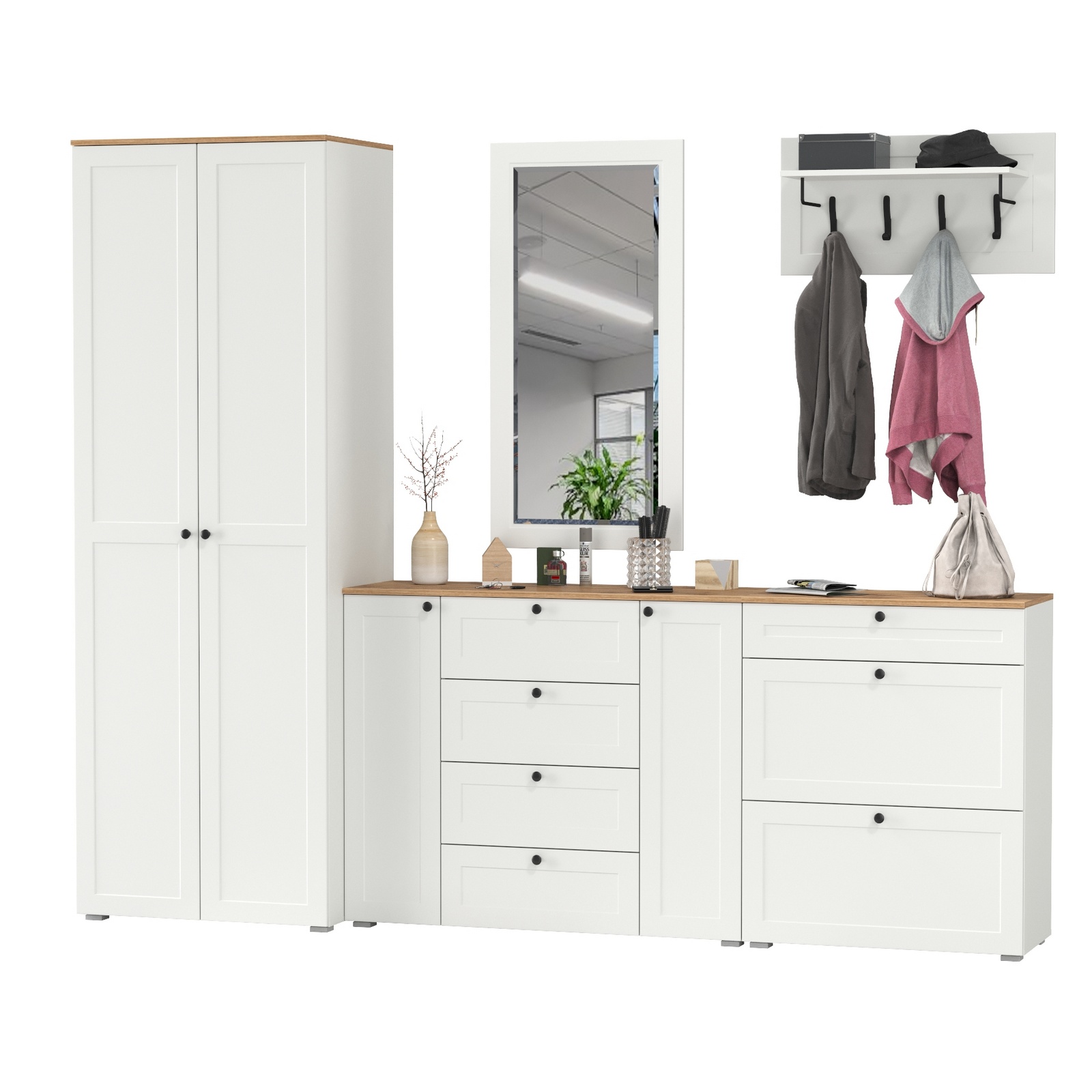 Комплектация состоит из шкафа Остин 13.224, комода Остин 16.221, тумбы для обуви Остин 16.121, вешалки Остин 15.12 и зеркала Остин 17.03. Шкаф с двумя распашными дверьми предлагает удобное решение для хранения вашей одежды и аксессуаров. В его верхней части устроена антресольная полка. Под ней горизонтальная штанга для одежды на плечиках, снизу полка и ниша. Макс. нагрузка на каждую полку - 5 кг. Комод имеет три части - центральная - это 4 выдвижных ящика, по бокам расположены закрытые распашными дверками ниши с двумя полками в каждой. В комоде предусмотрены съемные полки. Тумба с выдвижным ящиком и 2 откидными дверками с полками для 12 пар обуви снизу. Каждая откидная дверь расчитана для 6 пар невысокой обуви. Макс. нагрузка на каждую полку и ящик - 3 кг. Навесная вешалка с 4 двухрожковыми крючками и полкой для головных уборов. Полка для головных уборов над крючками и поддерживается 2 металл. элементами. Макс. нагрузка на каждый крючек - 1,5 кг, на полку - 5 кг. Навесное зеркало на панели из рамочного профиля МДФ. Зеркальное полотно имеет декоративный скос. Зеркало возможно повесить как горизонтально, так и вертикально. Скрытые крепежи зеркала. Скрытые направляющие выдвижных ящиков. Двери оснащены 4хшарнирными петлями без доводчиков. Мебель оснащена регулируемыми опорами из серого пластика. Лицевая фурнитура в виде черных аккуратных ручек. Изготовлена мебель из ЛДСП 16 мм, торцы окромлены ПХВ плёнкой. Фасады из рамочного профиля из МДФ со вставками ДВПО с узором. Поставляется в разобранном виде.