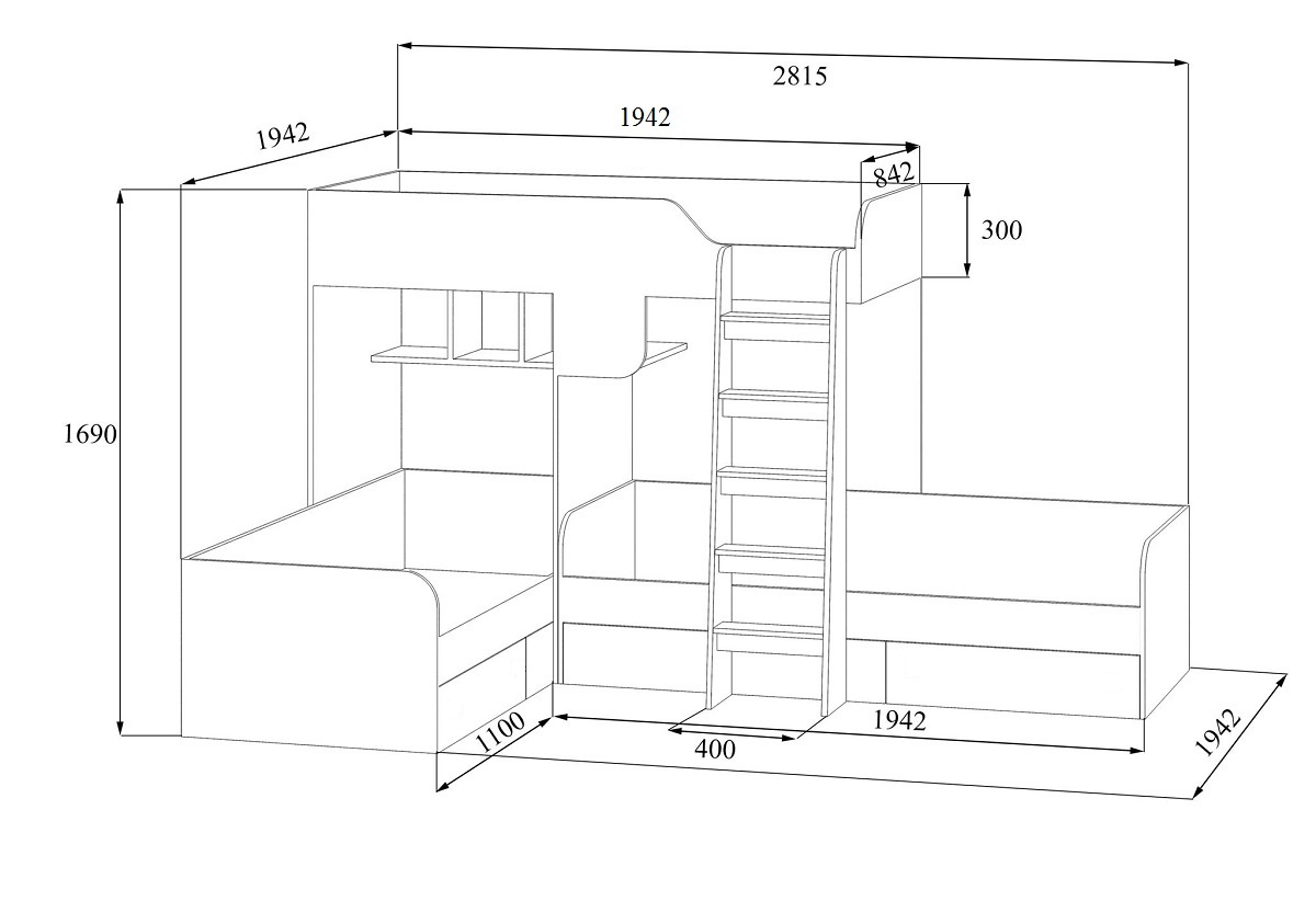 Двухъярусная кровать Трио является субкомпактным вариантом размещения сразу трех детей. За счет углового исполнения она позволит сэкономить полезное пространство в комнате. Но относительно компактные размеры не сказались на функционале - кровать обладает тремя полноценными спальными местами, а так же полочками и ящиками.