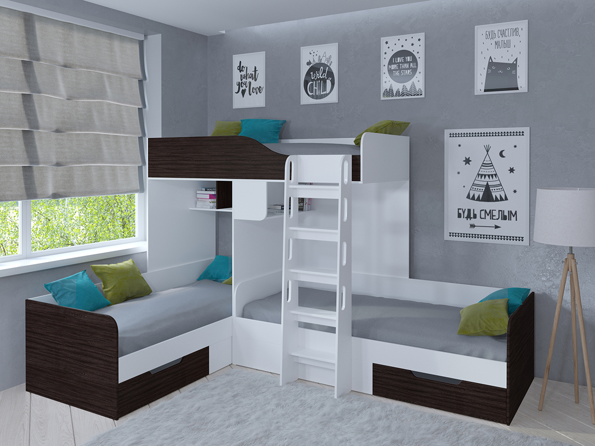 Двухъярусная кровать Трио является субкомпактным вариантом размещения сразу трех детей. За счет углового исполнения она позволит сэкономить полезное пространство в комнате. Но относительно компактные размеры не сказались на функционале - кровать обладает тремя полноценными спальными местами, а так же полочками и ящиками.