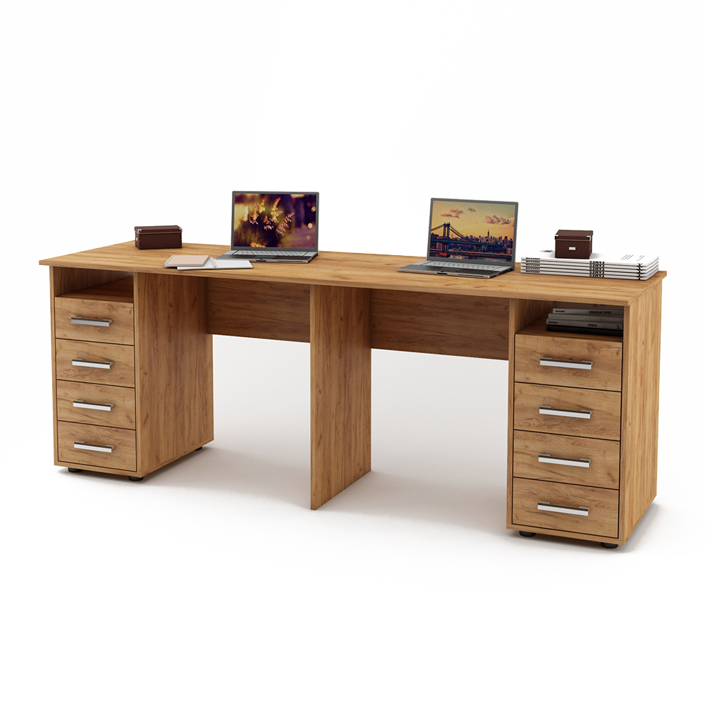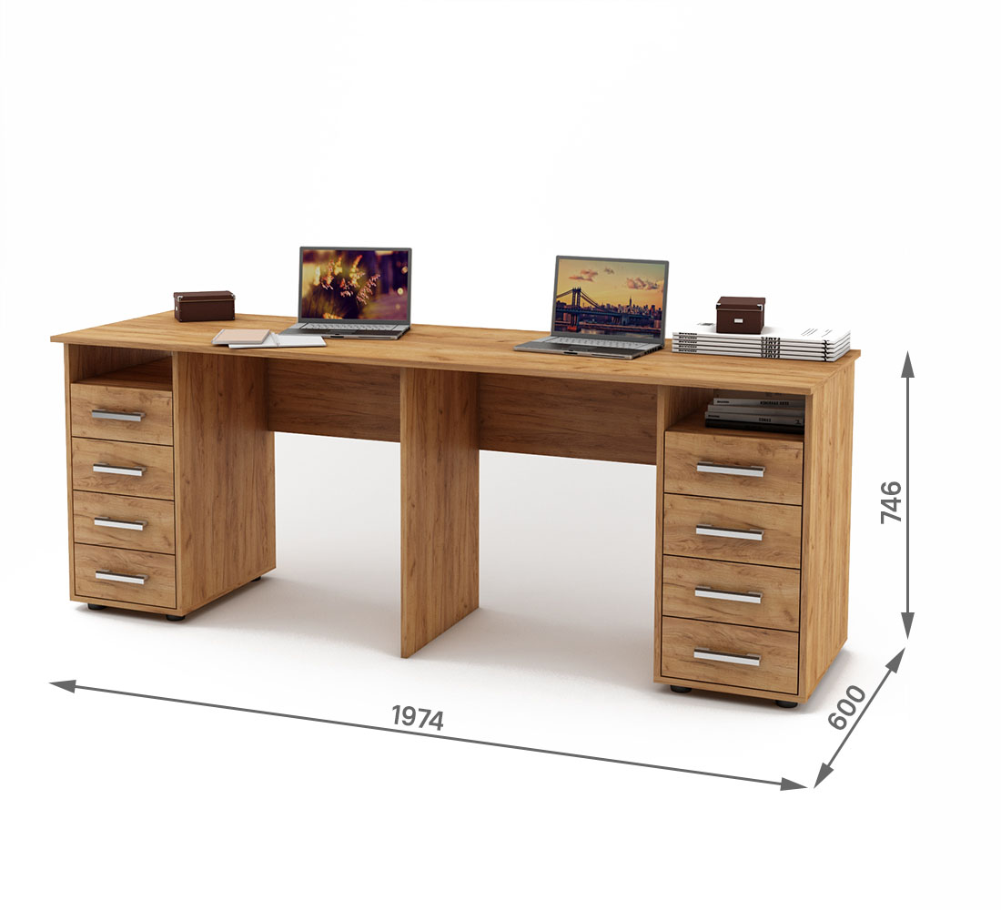 Стол обеспечит рабочими местами сразу двух человек и будет отличным выбором как для небольшого офиса, так и для домашнего интерьера. Стол позволяет вместить все необходимое, при этом не мешая рабочему процессу.