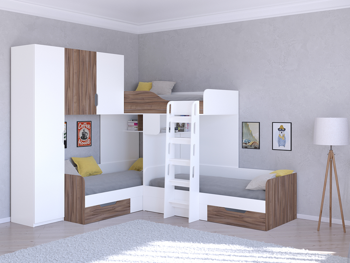 Двухъярусная кровать Трио/1 является субкомпактным вариантом размещения сразу трех детей. За счет углового исполнения она позволит сэкономить полезное пространство в комнате. Но относительно компактные размеры не сказались на функционале - кровать обладает тремя полноценными спальными местами, а так же полочками и ящиками. В отличии от базовой версии кровати данная модель дополнена высоким пеналом с пятью полками и вместительной антресолью. Благодаря этому можно с удобством хранить еще больше вещей.