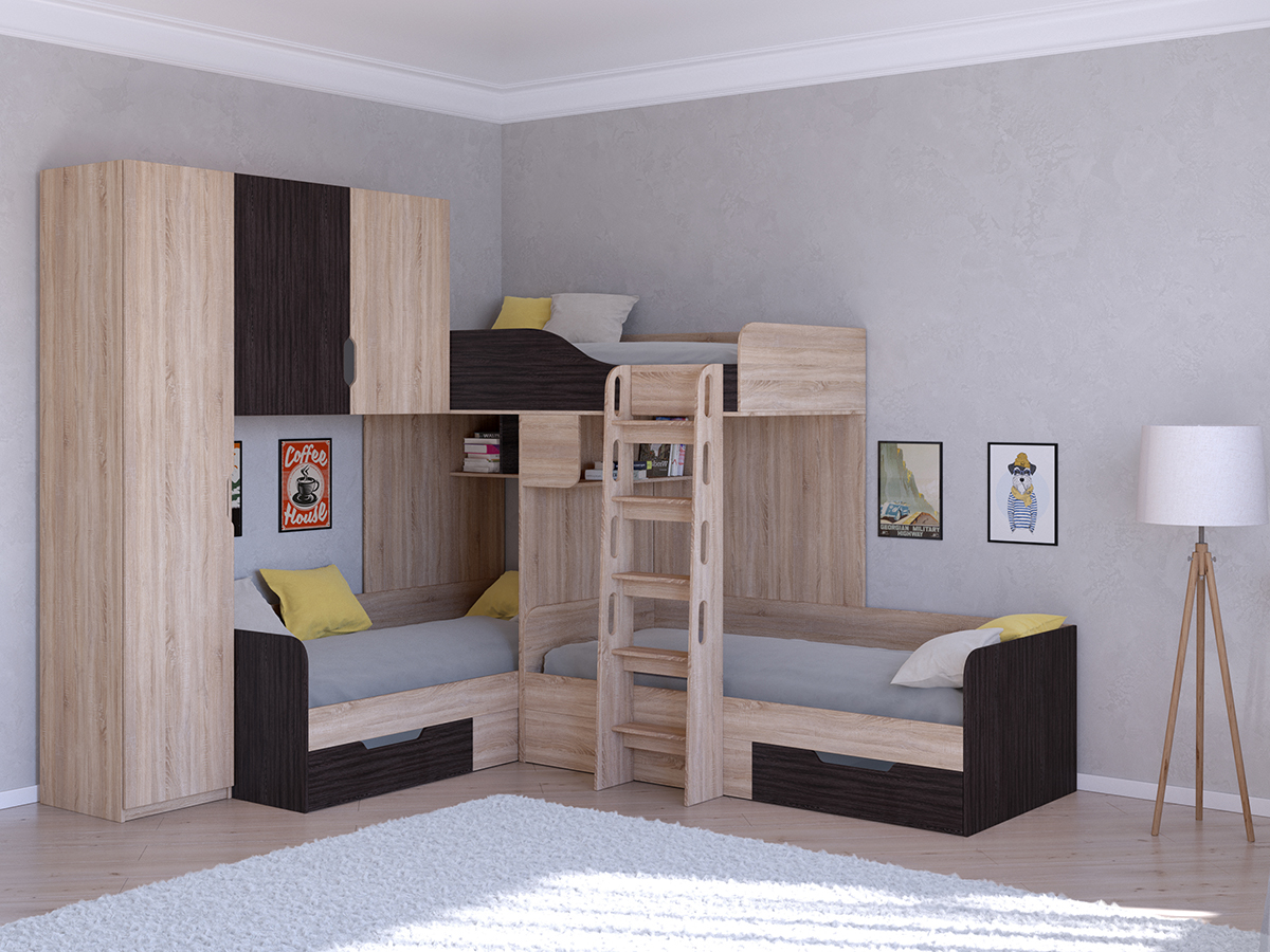 Двухъярусная кровать Трио/1 является субкомпактным вариантом размещения сразу трех детей. За счет углового исполнения она позволит сэкономить полезное пространство в комнате. Но относительно компактные размеры не сказались на функционале - кровать обладает тремя полноценными спальными местами, а так же полочками и ящиками. В отличии от базовой версии кровати данная модель дополнена высоким пеналом с пятью полками и вместительной антресолью. Благодаря этому можно с удобством хранить еще больше вещей.