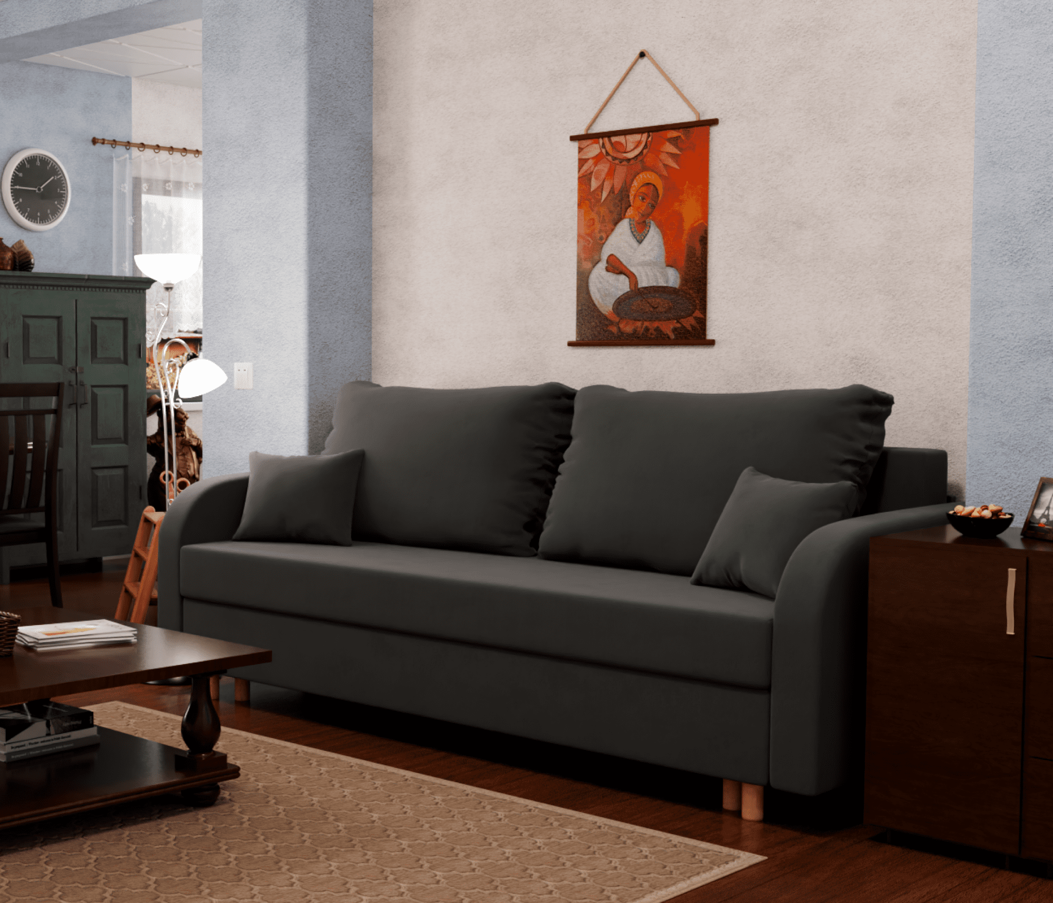 Механизм трансформации "еврокнижка" позволяет легко превратить диван в кровать, что делает его более практичным в использовании. Диван-кровать может использоваться как для сидения, так и для сна.